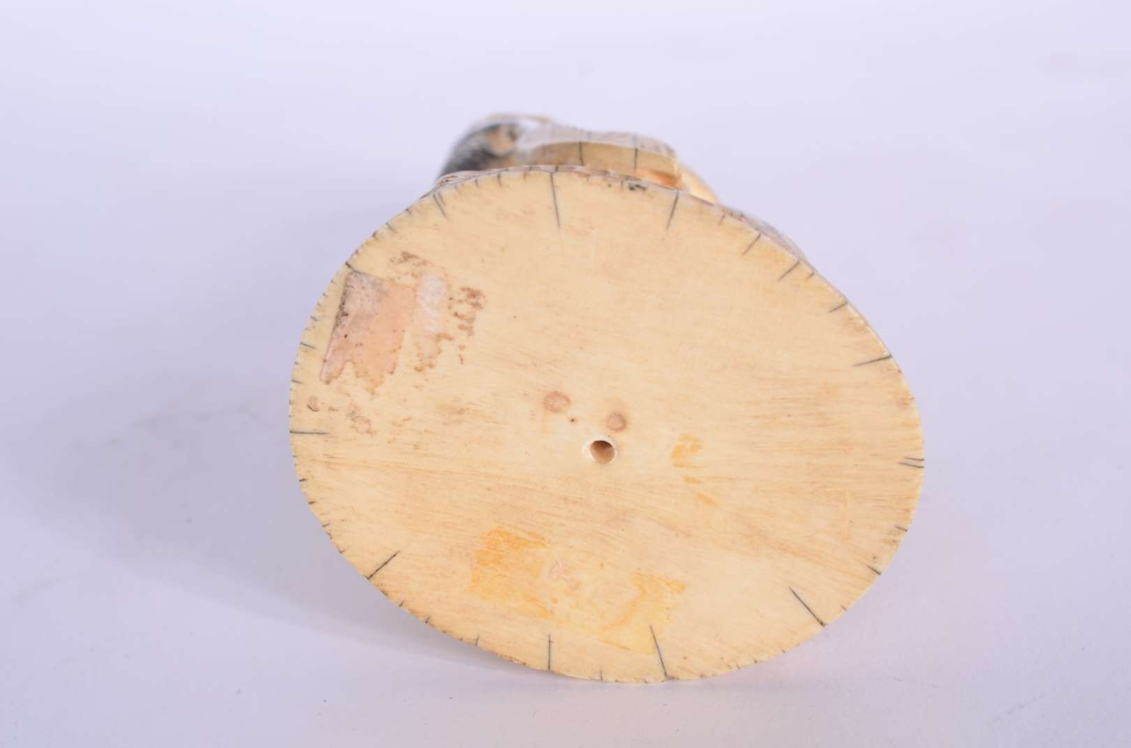 Escultura esculpida em marfim, trabalho chinês do primeiro quartel do séc. XX, corpo de formato oval ricamente esculp...
