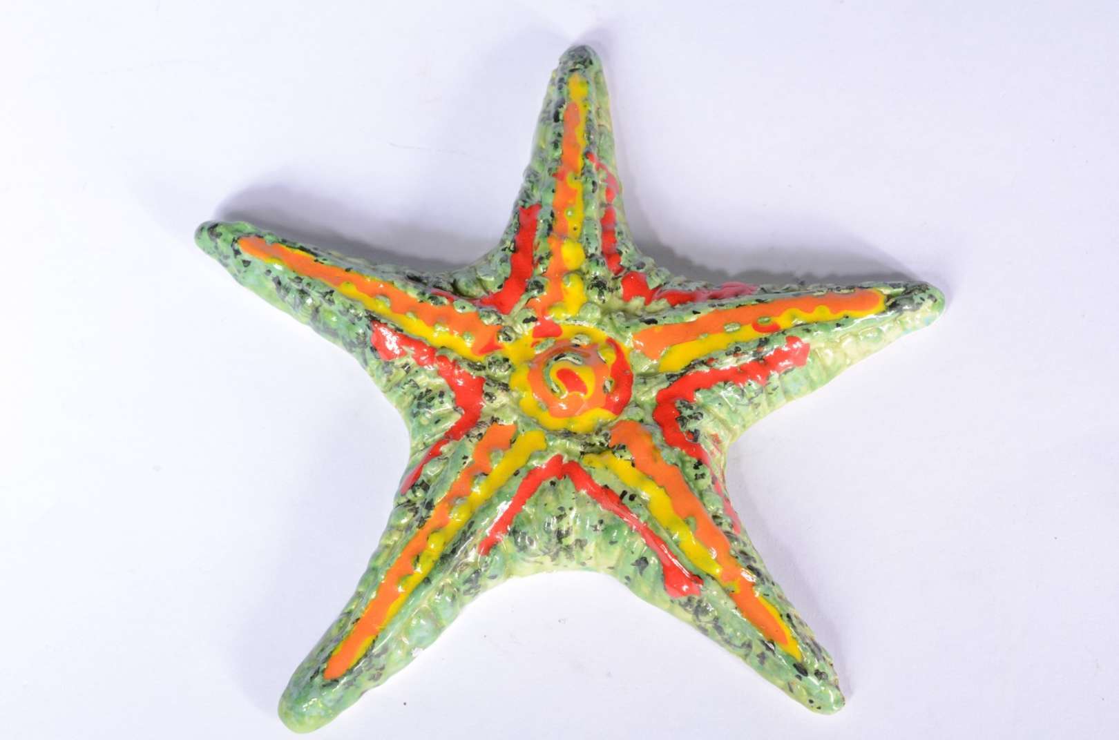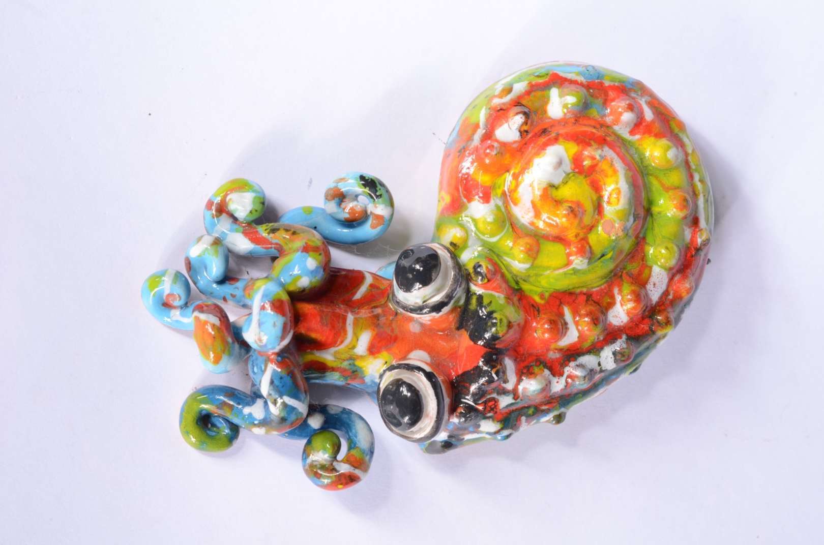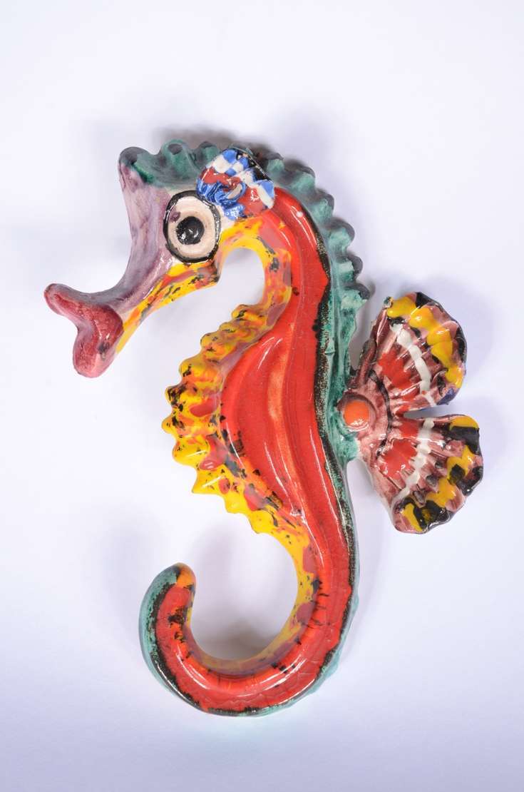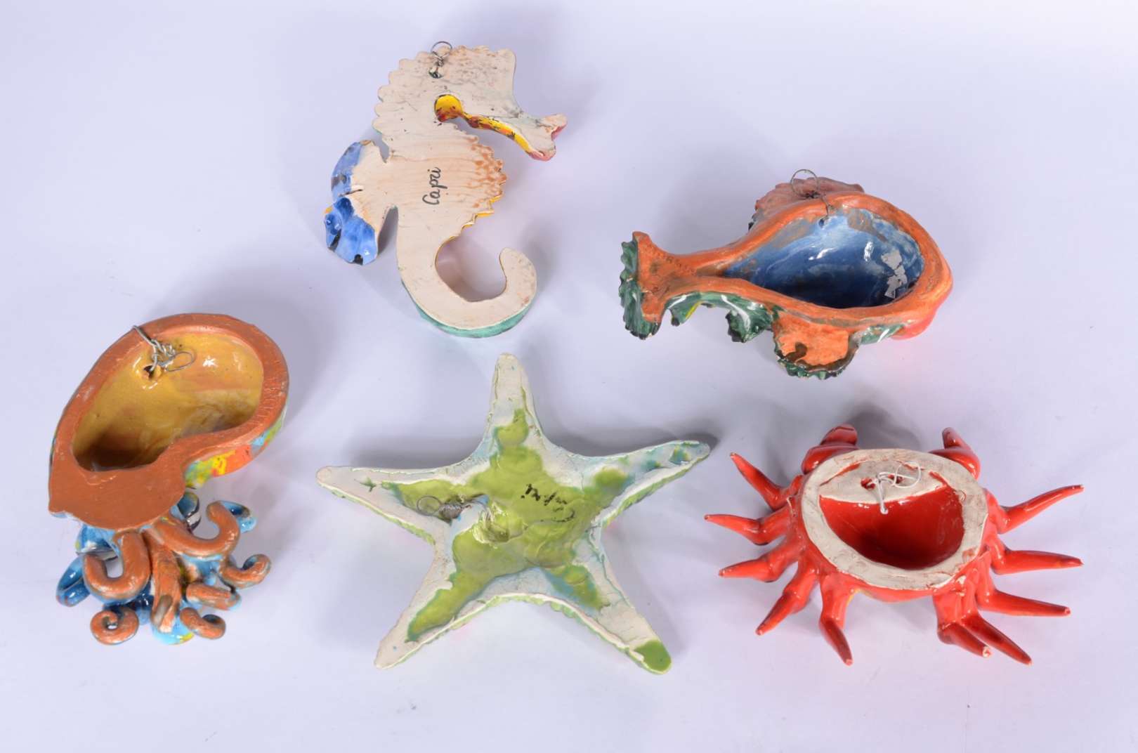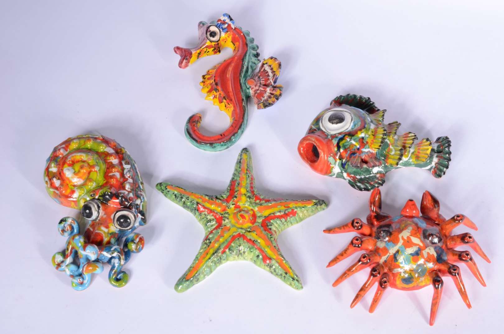Cinco estatuetas de barro cozido policromado, sendo 4 "bois bumbá" (um com chifre quebrado), e golfinho.
