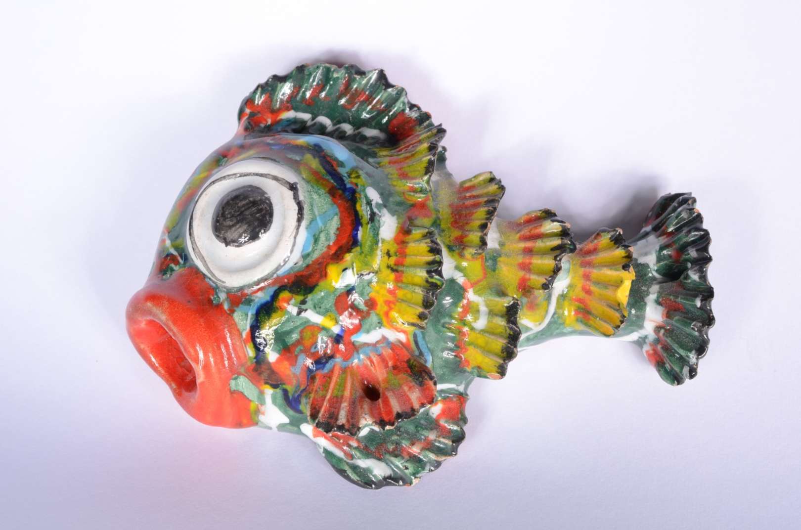 Grupo escultórico de marfim policromado representando pescador com vara de pescar e peixe na linha.