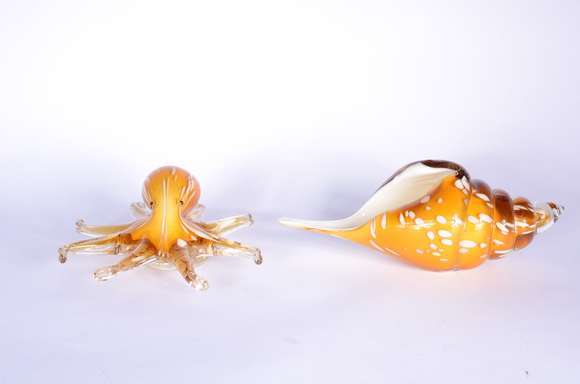 Duas peças decorativas de murano, sendo: concha e polvo.