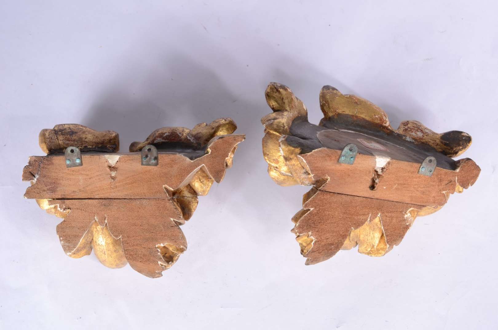 Dois medalhões com puxadores aparafusados de metal dourado oriental.
