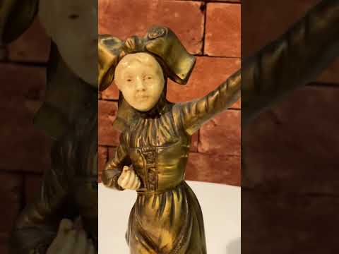 Escultura de biscuit com detalhes dourados representando figura feminina com anjo e cornucópia. Desgastes. Marcas na ...