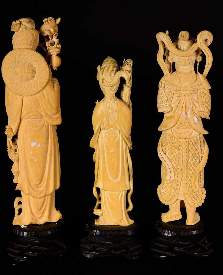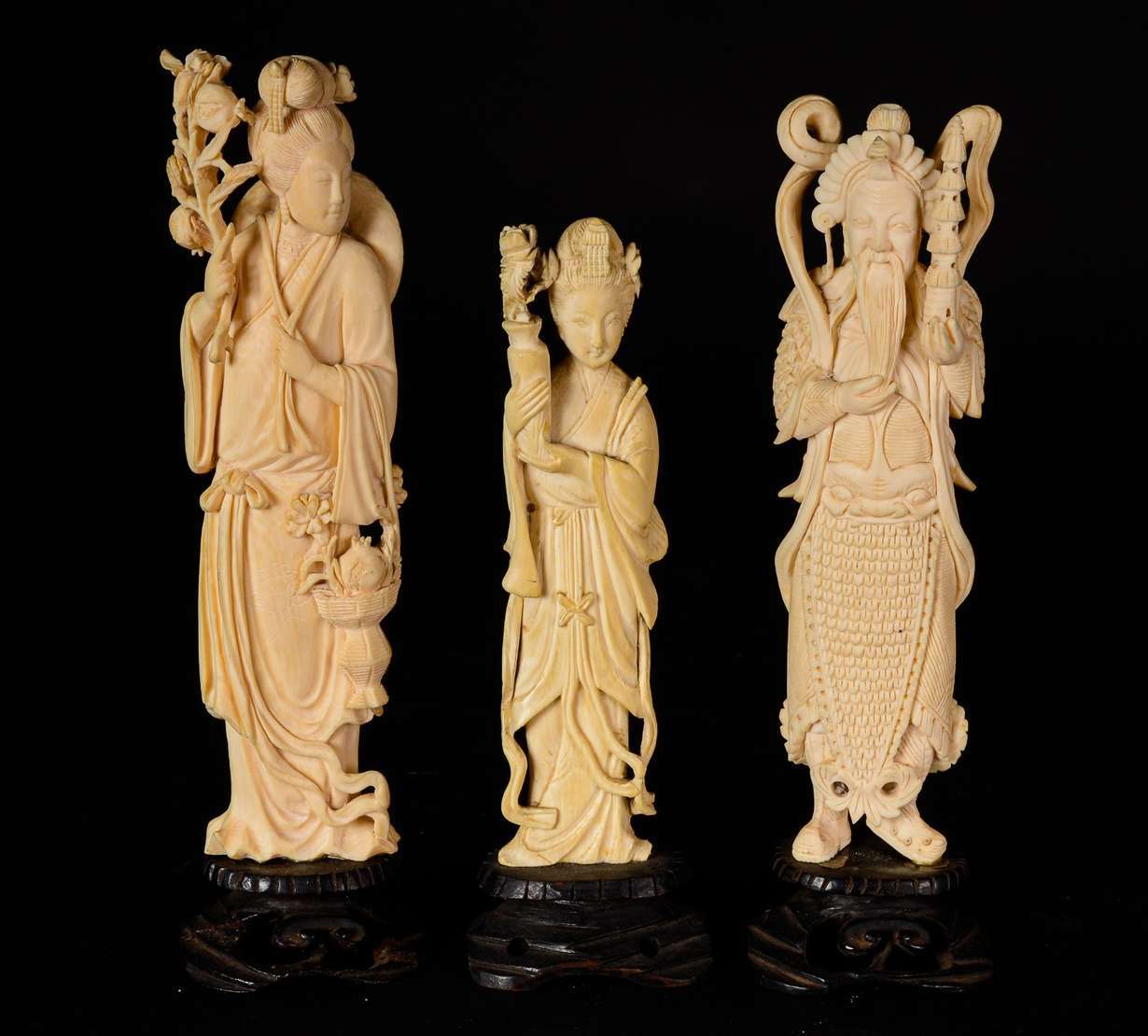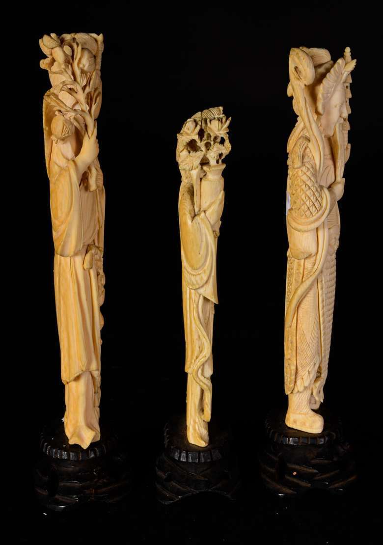 Escultura de marfim representando gueixa com flores, base de madeira. Altura total: 33 cm.