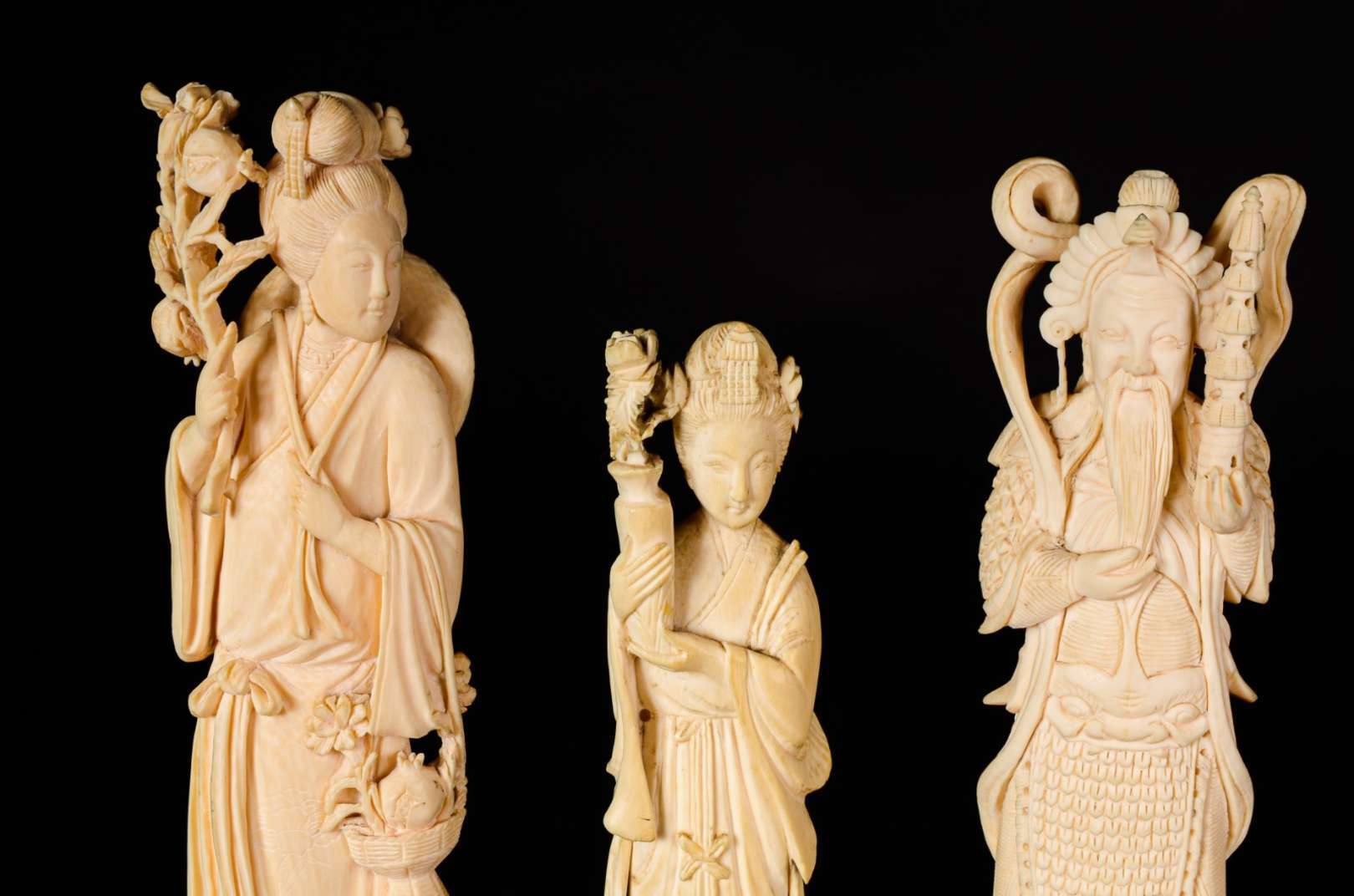 Escultura esculpida em marfim, trabalho chinês do primeiro quartel do séc. XX, corpo de formato oval ricamente esculp...