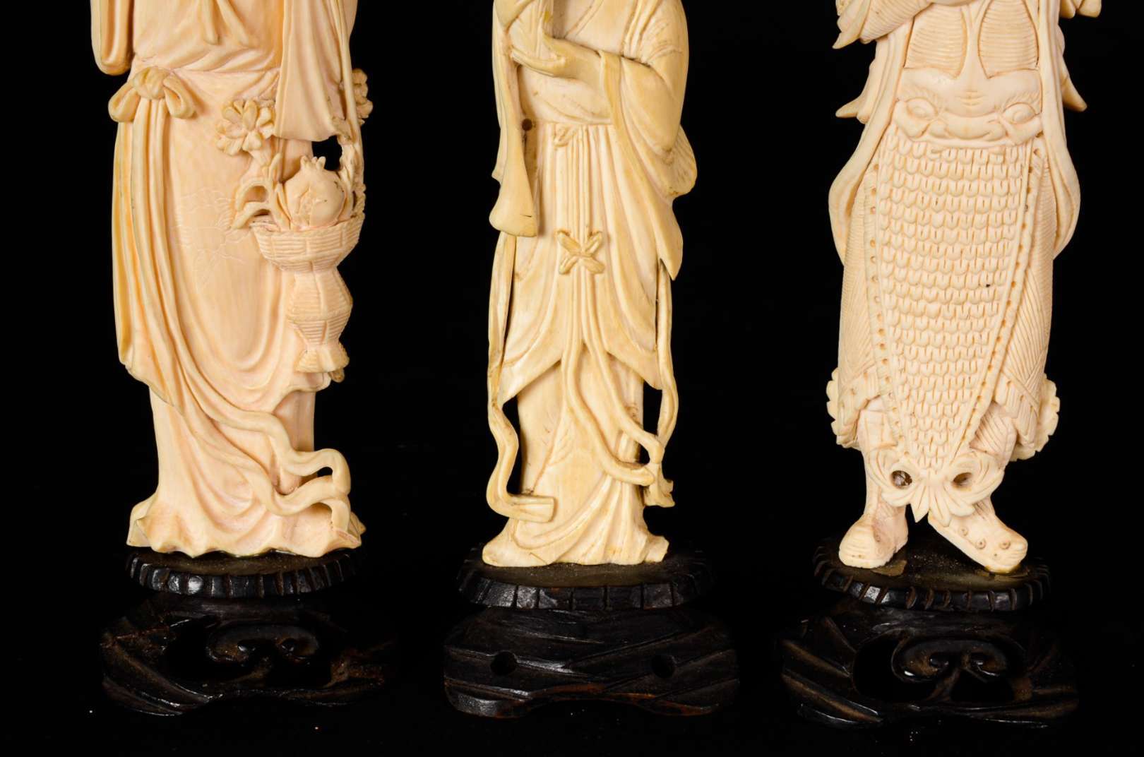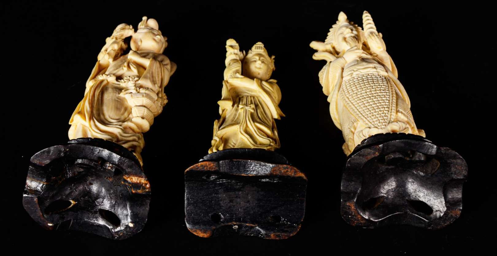 Original conjunto de quatro estatuetas japonesas em madeira com rostos e mãos em marfim. Representa a sociedade japon...
