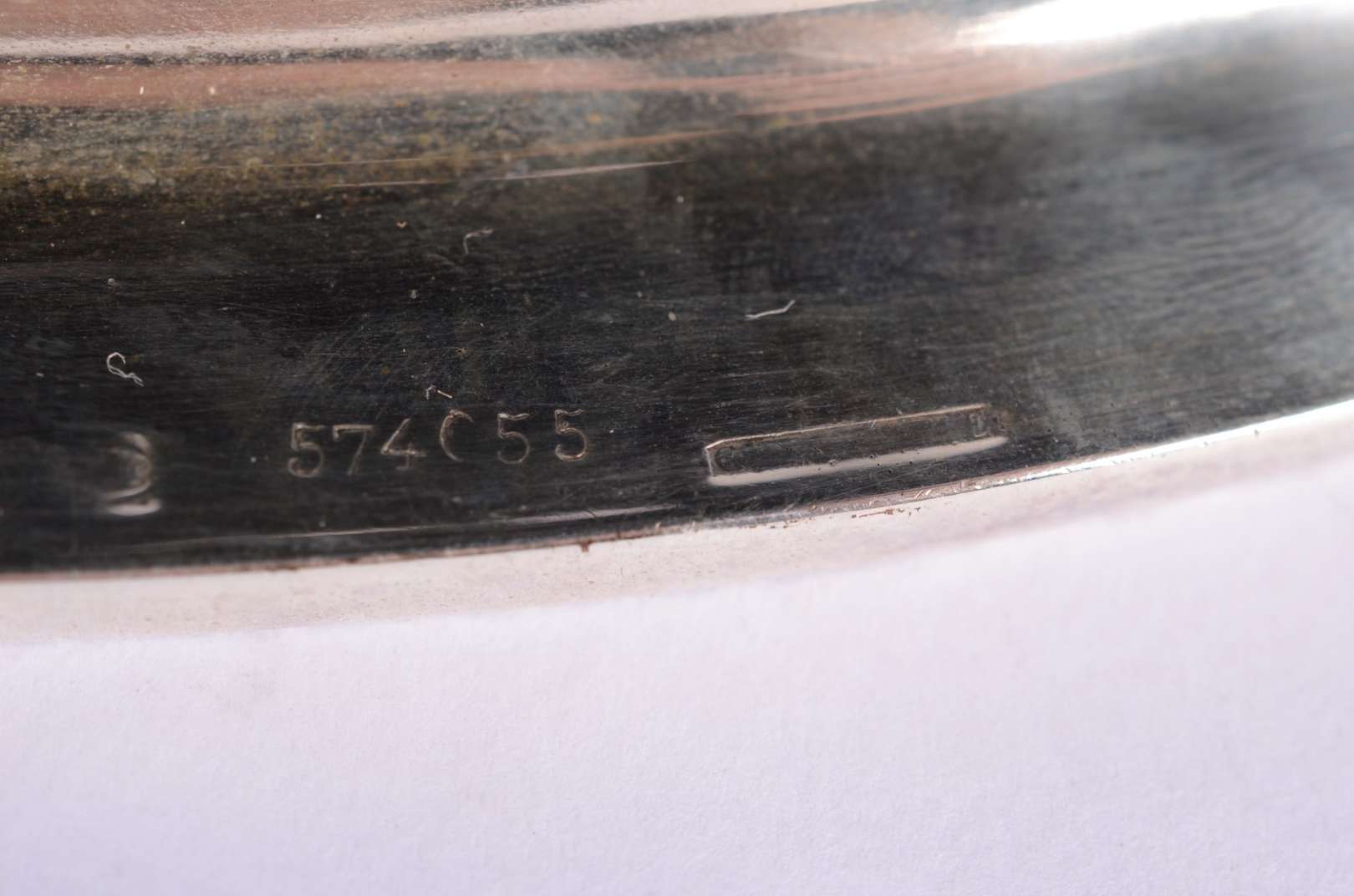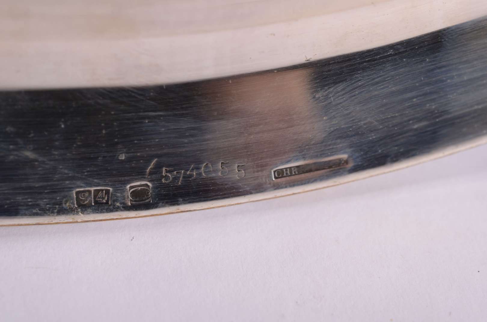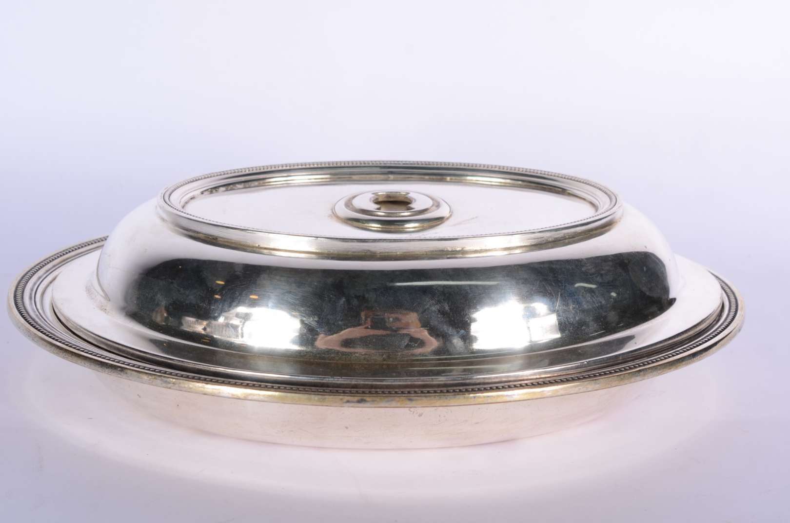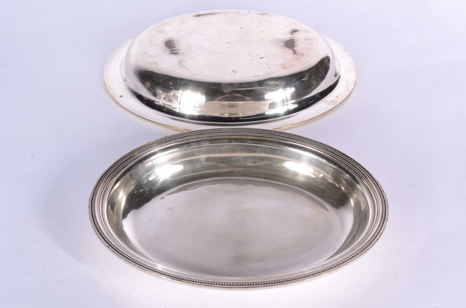 Travessa feitio oval de prata alemã contraste 800 mls., borda trabalhada em relevo. Peso da prata: 530 g. (Por motivo...