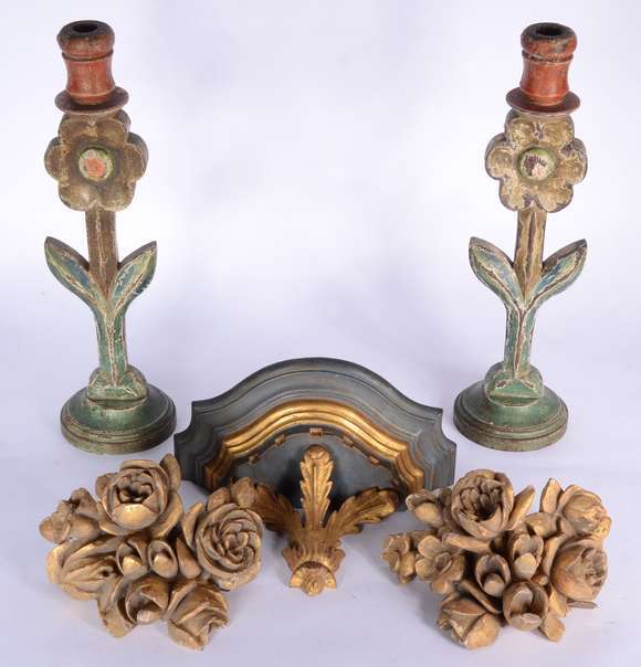 Cinco peças de madeira entalhada e patinada, sendo: par de castiçais na forma de flores; e, 3 peanhas, sendo 2 florai...