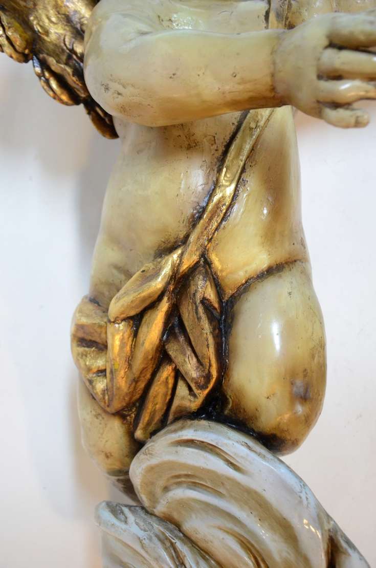 Escultura de marfim policromado representando figura feminina com aves nos ombros e bolsas penduradas com peixes.