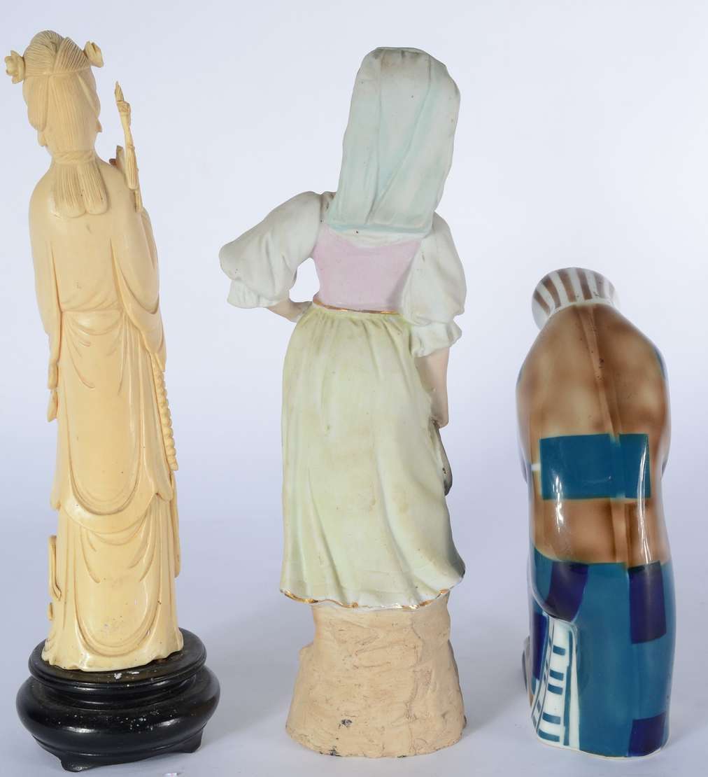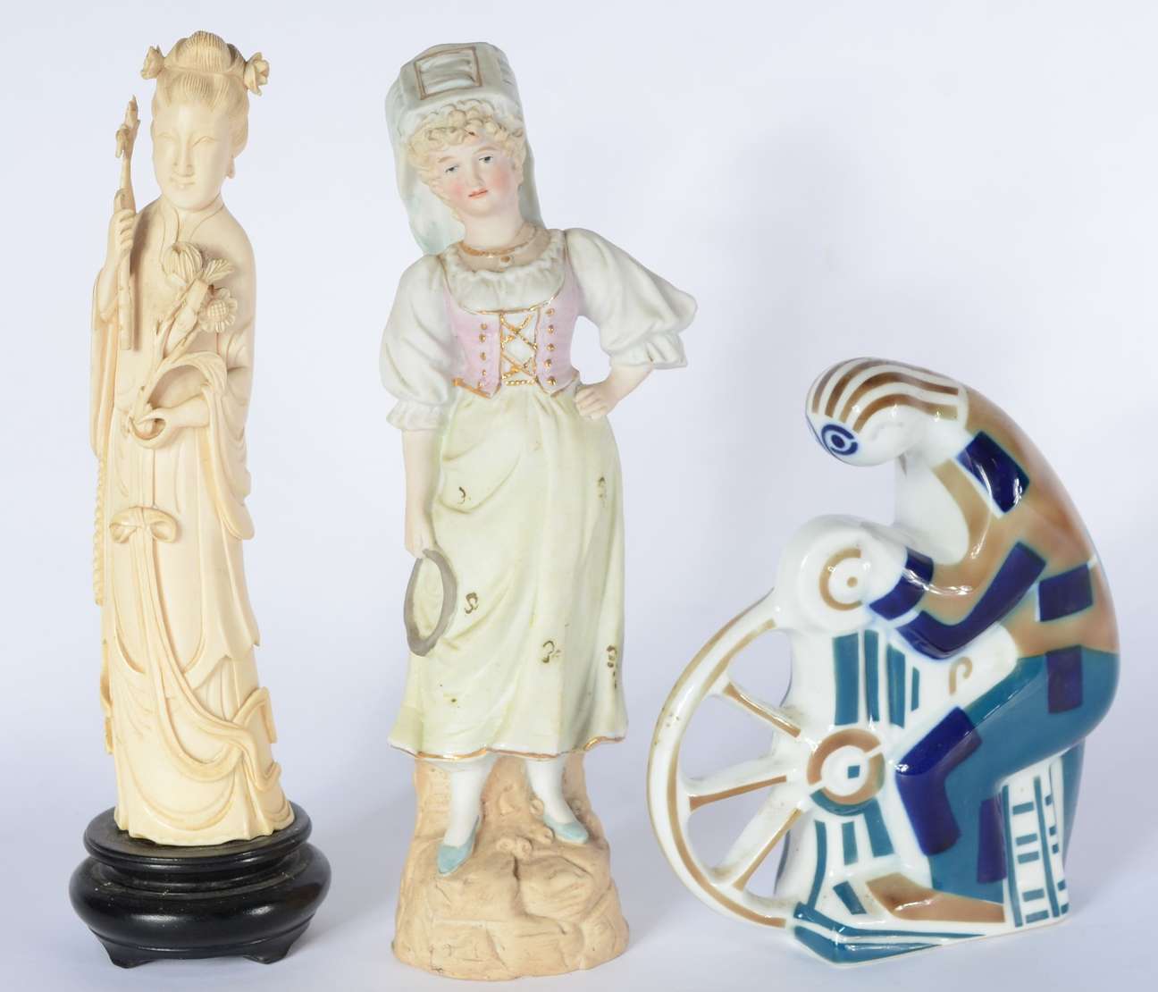 Escultura de marfim policromado representando figura feminina com aves nos ombros e bolsas penduradas com peixes.