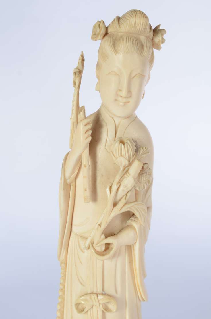 Antiga escultura chinesa em marfim representando imperatriz, vestindo longa e ampla túnica formal, ornada por medalhõ...