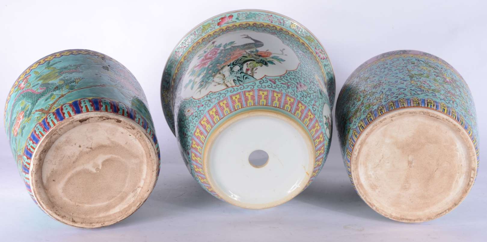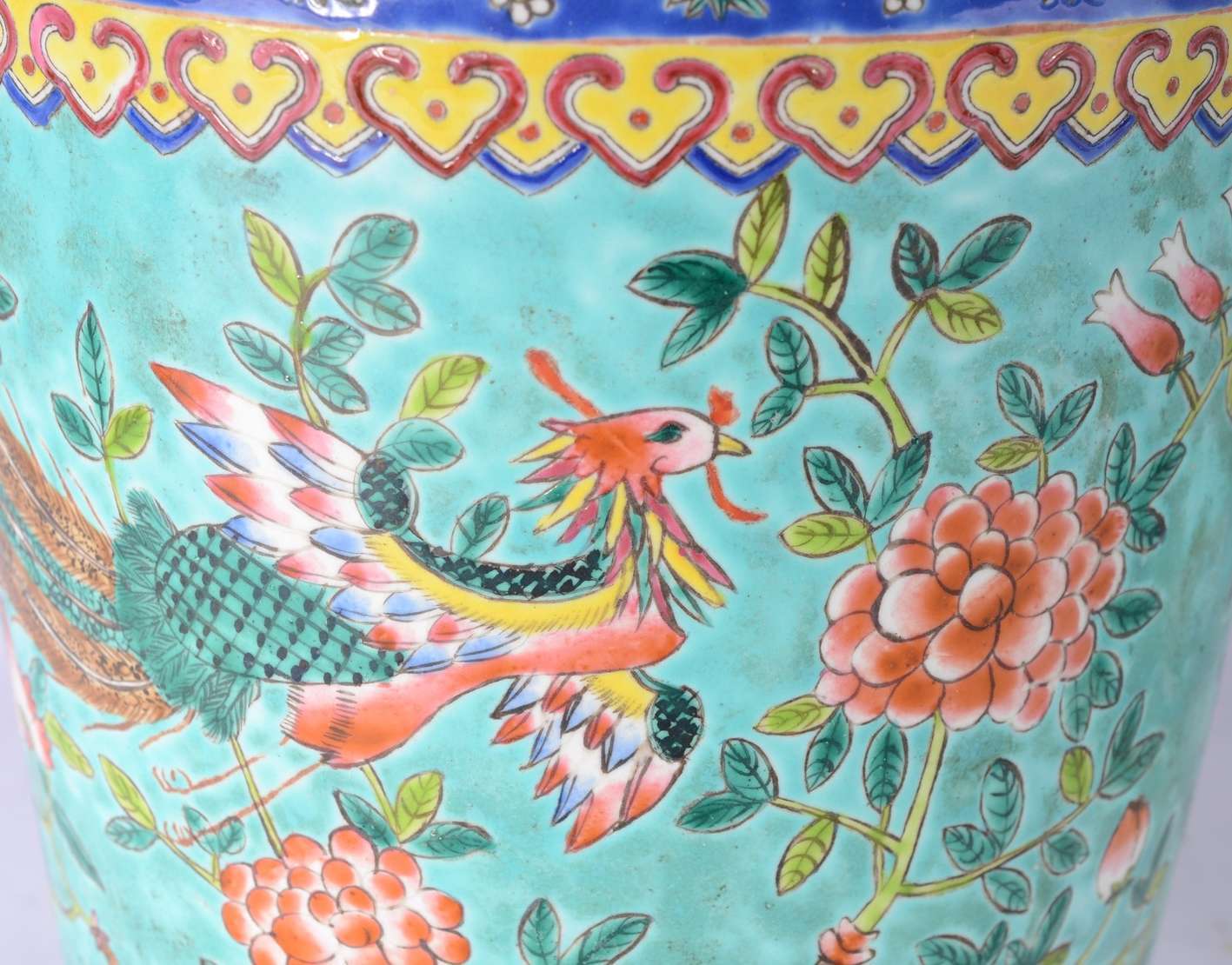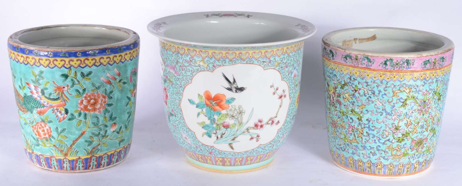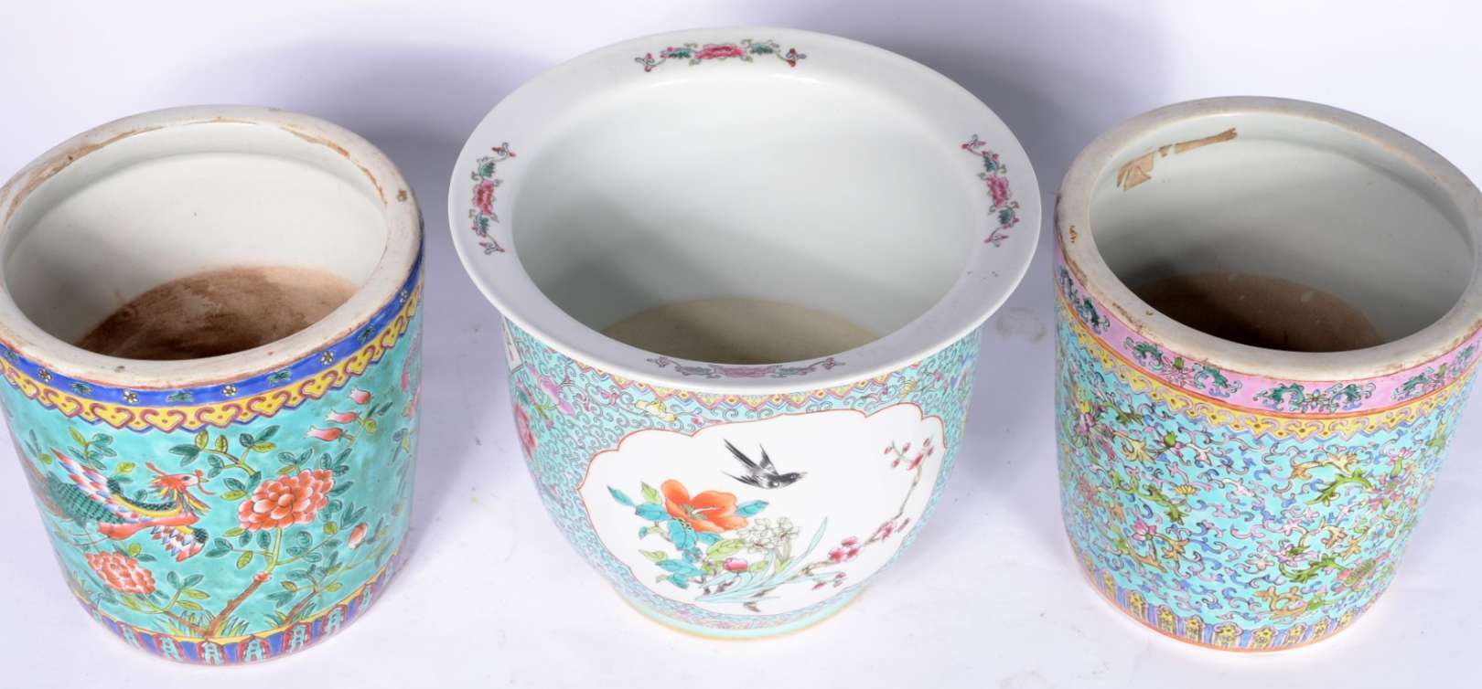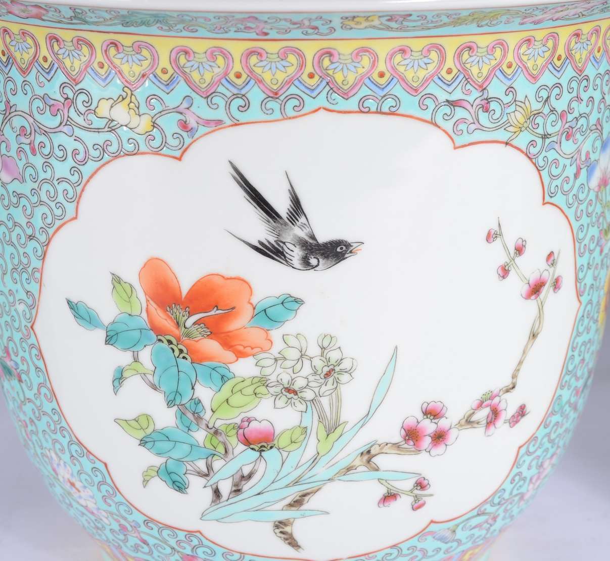 Dois cachepots de porcelana chinesa, um deles com prato e decorado com aves e vegetação em policromia, e o outro com ...