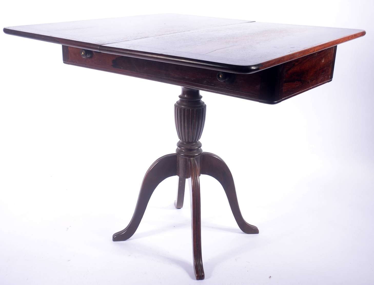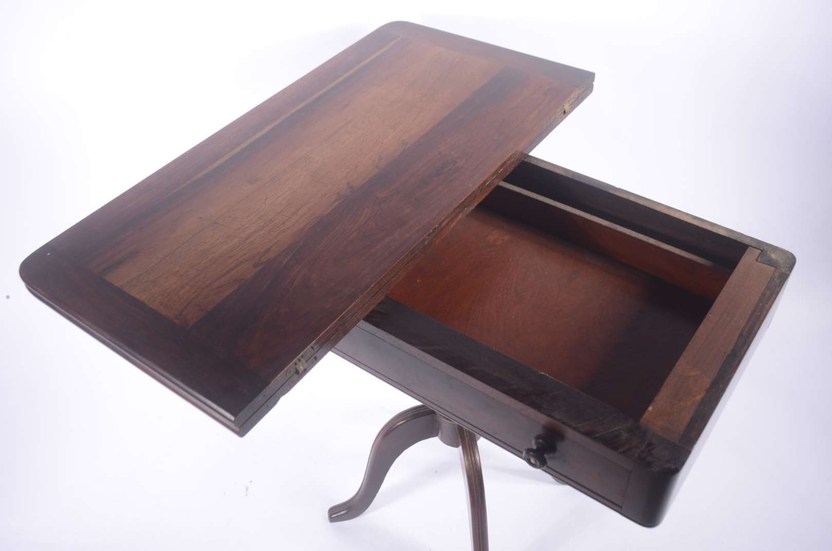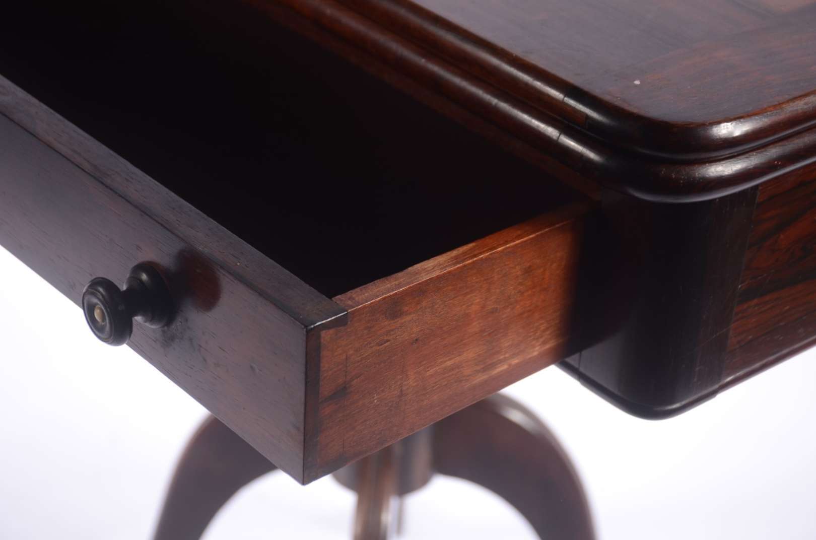 Mesa auxiliar de madeira ebanizada, platô inferior com gavetinha, pernas cilíndricas e ponteiras de bronze.