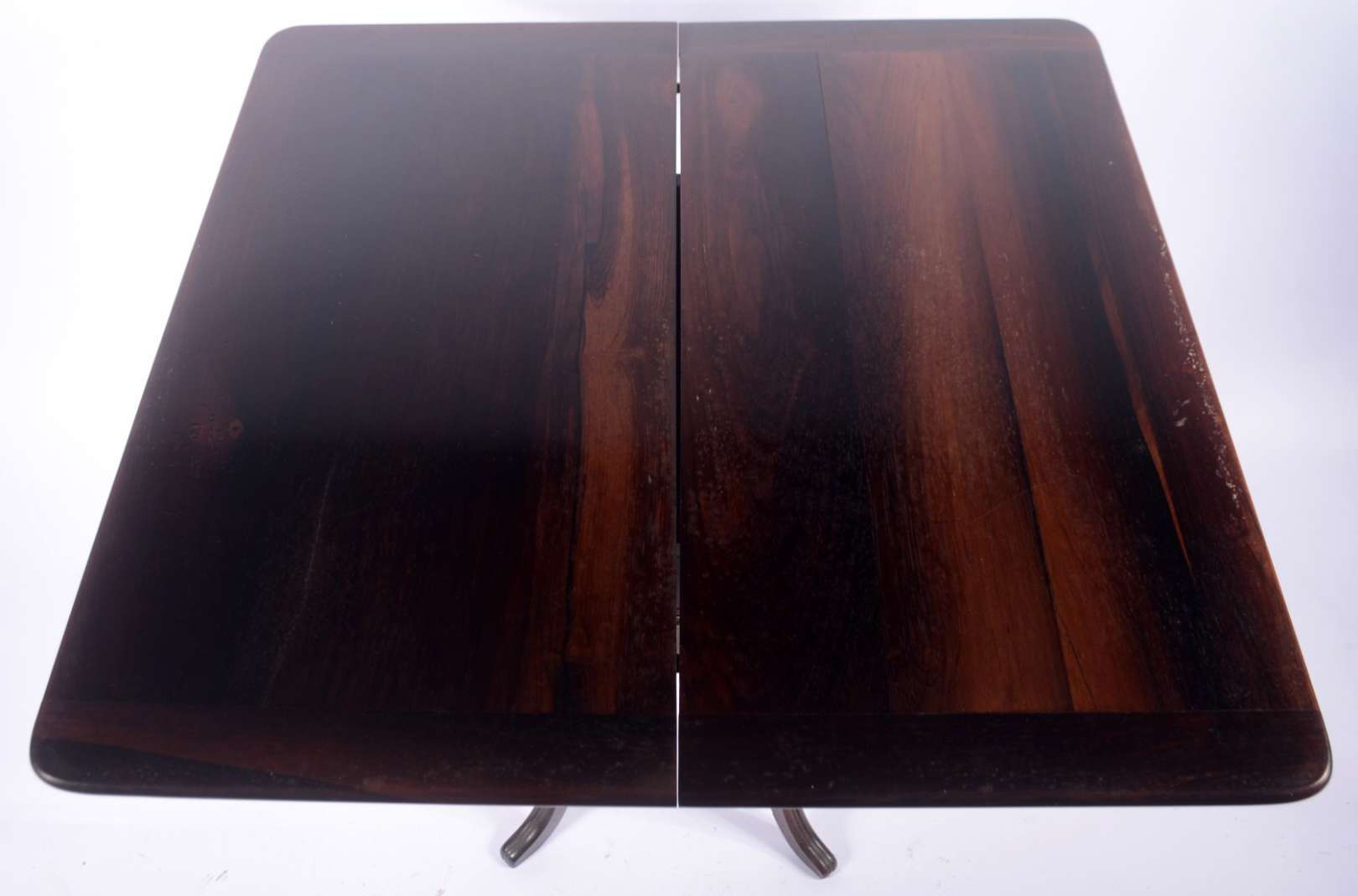 Mesa auxiliar de madeira nobre, tampo e saia recortados, pernas longas ligeiramente recurvas. Tampo coberto por vidro.