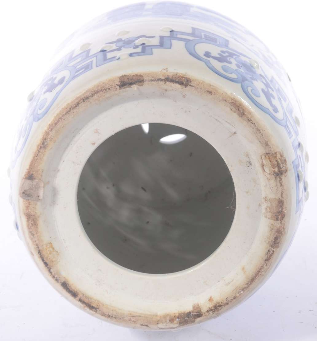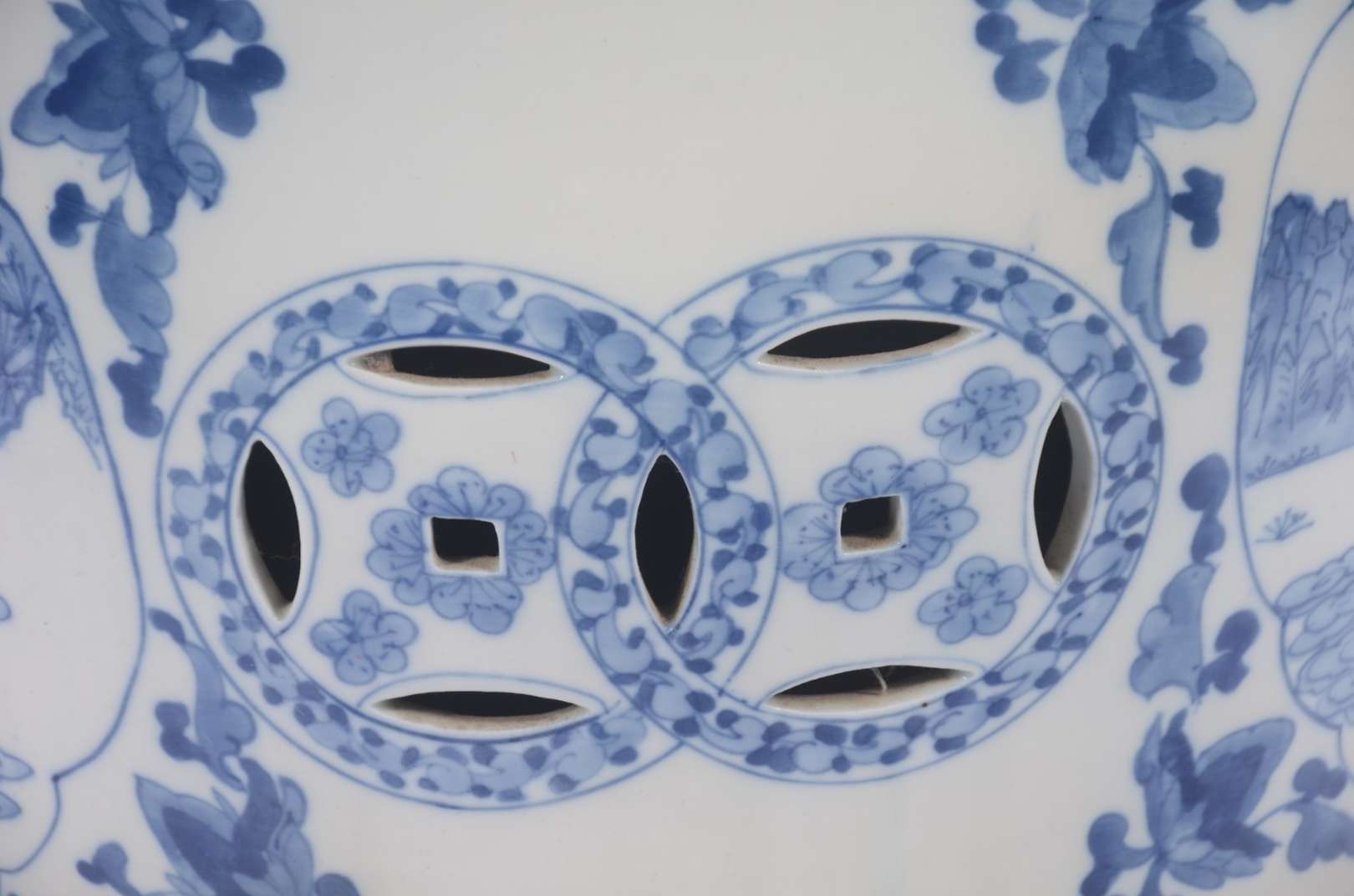 Cachepot com prato de porcelana oriental decorada com figura de dragão em azul e branco, acompanha base de madeira.