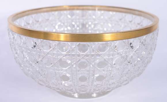 Bowl de cristal lapidação "tijolinho", borda de metal dourado.