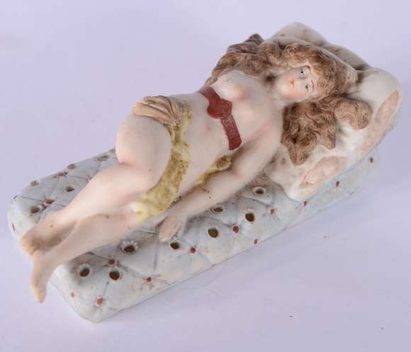 Paliteiro de biscuit policromado representando figura feminina repousando.