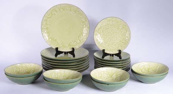 Serviço de jantar "Asian" de cerâmica verde, composto de: 8 pratos rasos, 8 pratos fundos e 8 pratos de sobremesa (um...