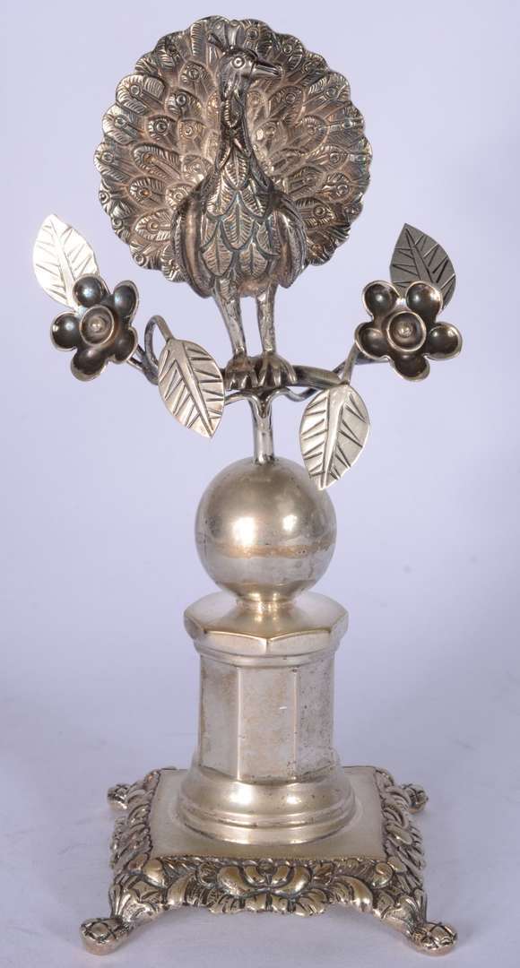 Paliteiro de prata portuguesa, contraste P Coroa, representando pavão sobre galho com folhas e flores. Peso da prata:...