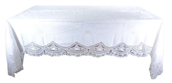Toalha de mesa de renda branca, com manchas.