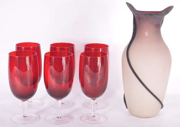 Diversas peças, sendo: conjunto com 6 copos de vidro vermelho e, vaso decorativo de vidro fosco degradé com "serpenti...