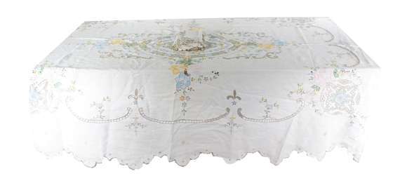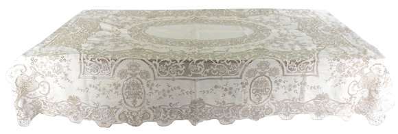 Toalha de mesa de renda veneziana bege. Acompanham 12 guardanapos.