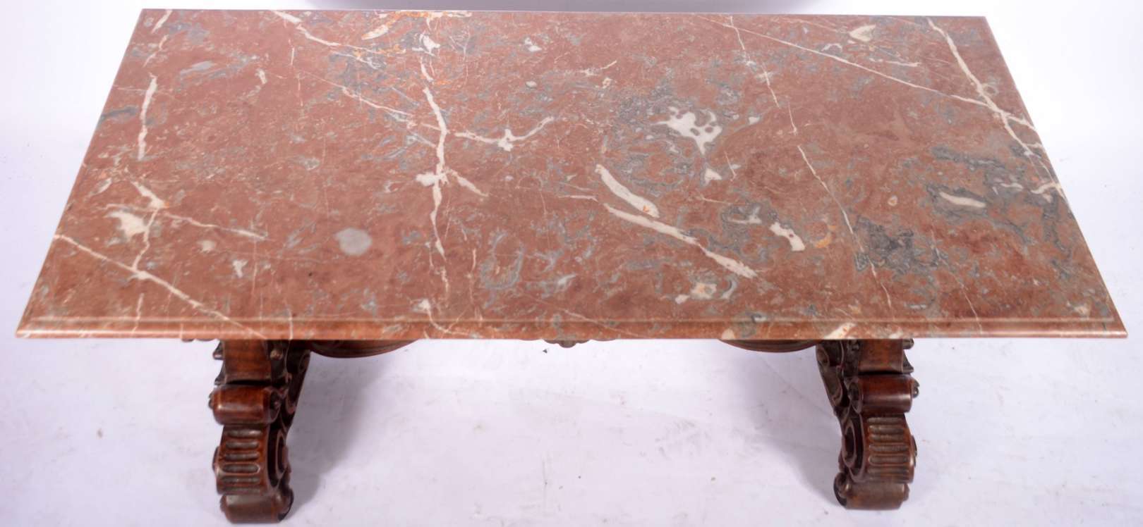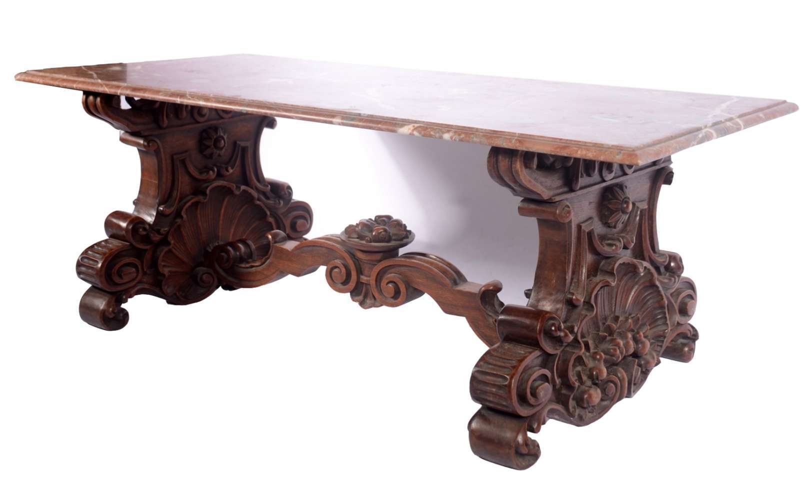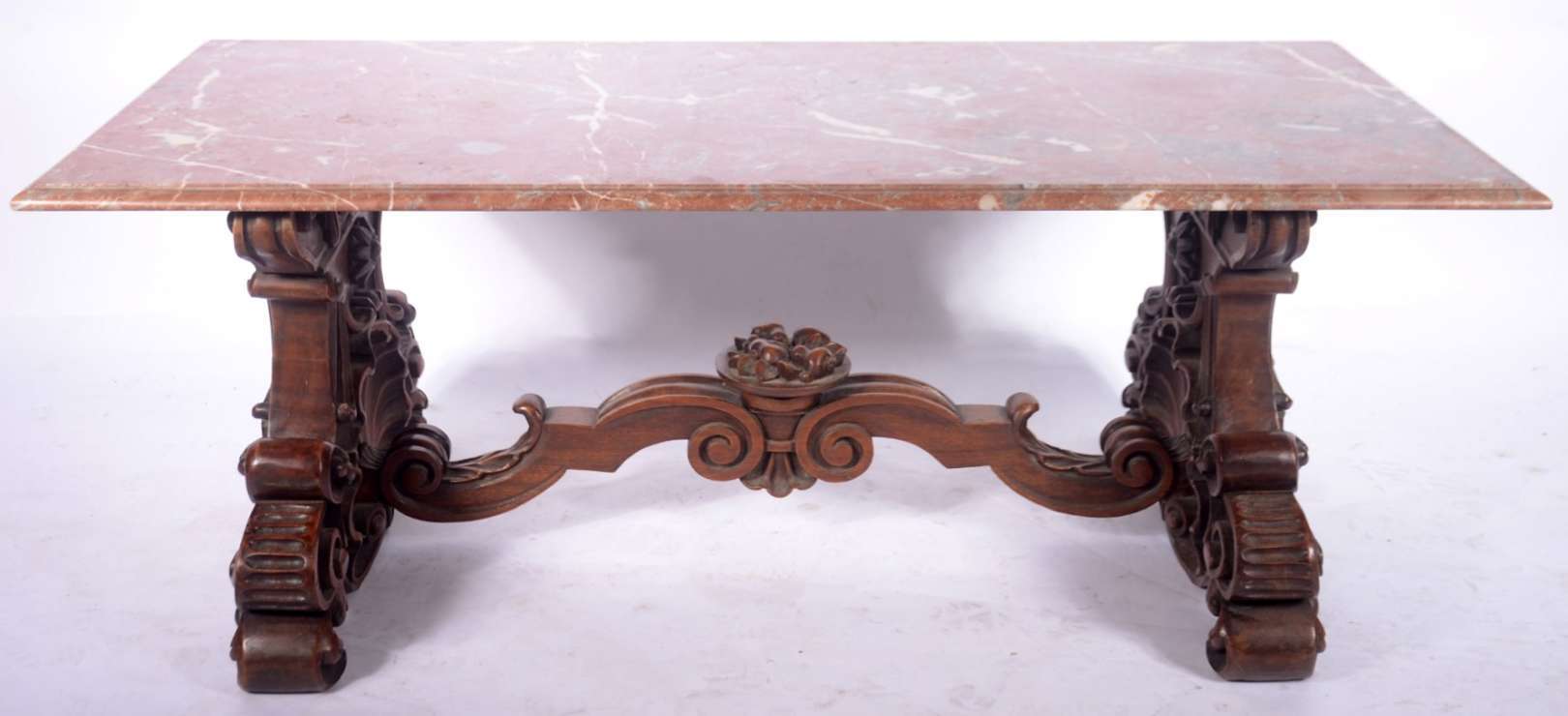Mesa de centro com base de madeira nobre ricamente entalhada com concheados e florões, tampo de mármore.