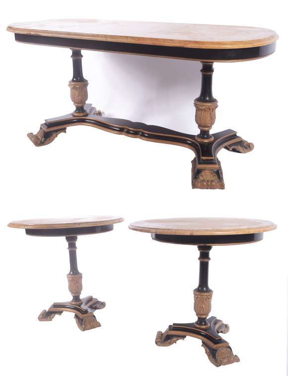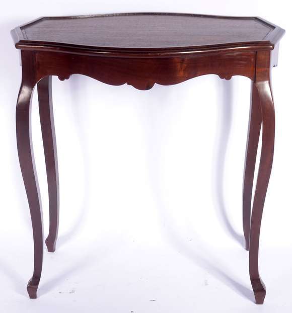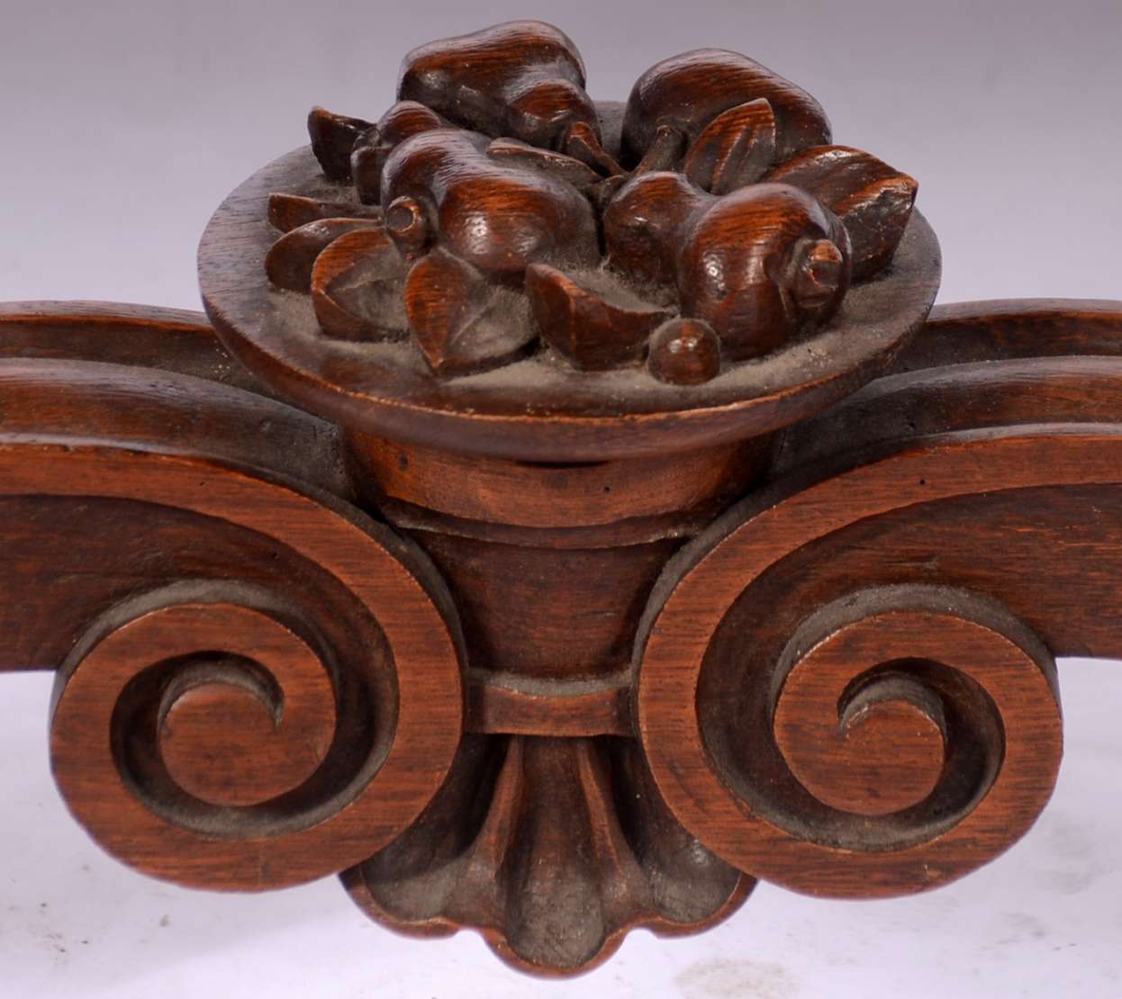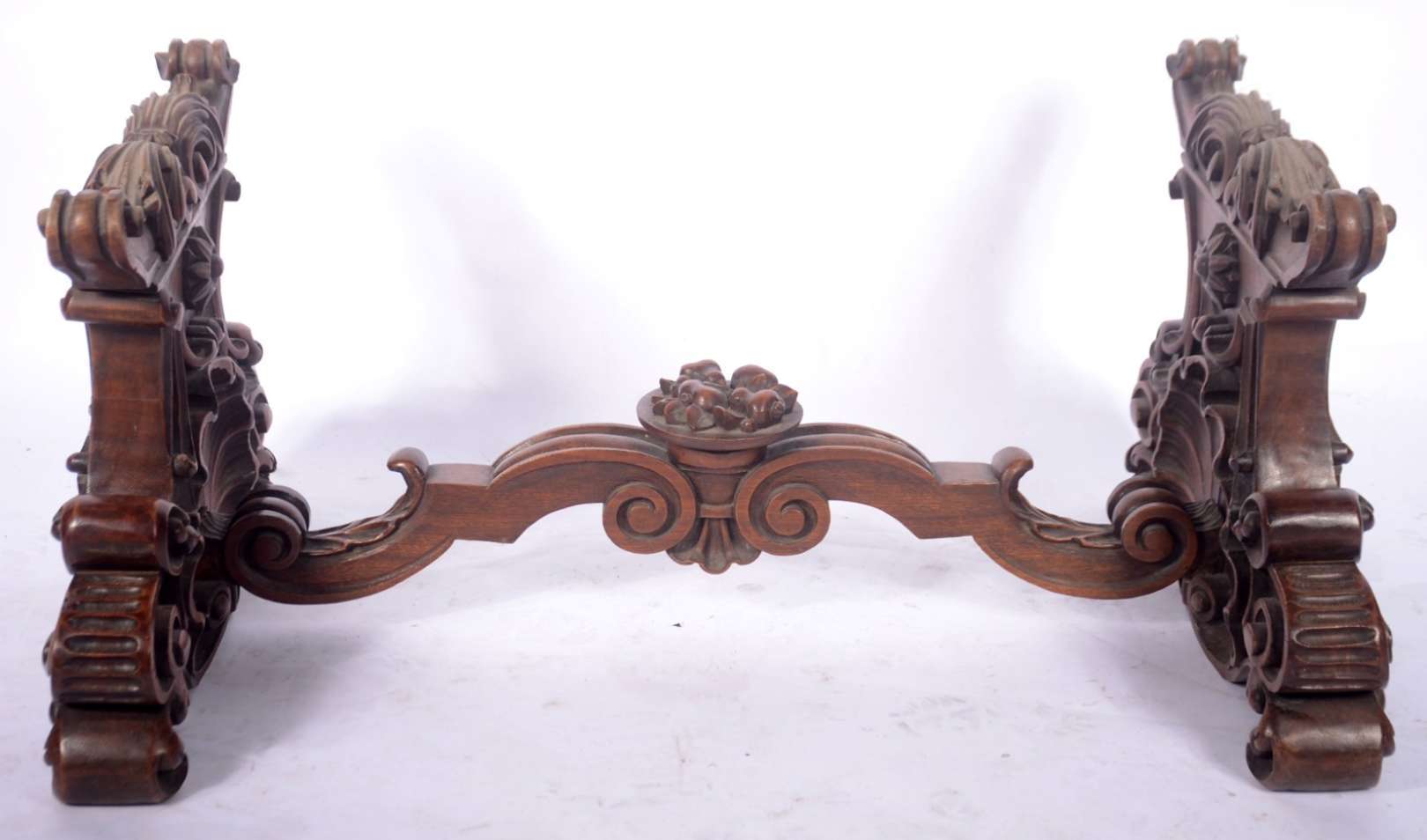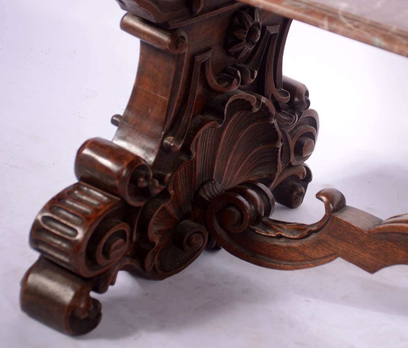 Mesa de centro com base de madeira nobre ricamente entalhada com concheados e florões, tampo de mármore.