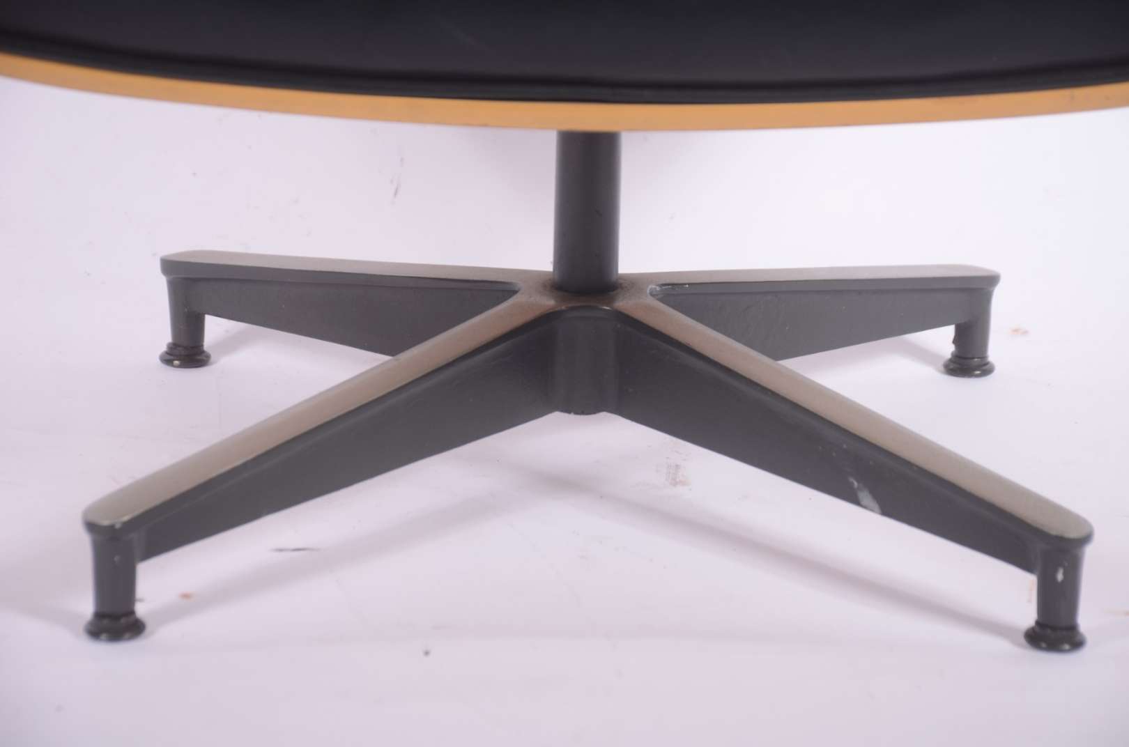 Mesa auxiliar de madeira ebanizada, platô inferior com gavetinha, pernas cilíndricas e ponteiras de bronze.