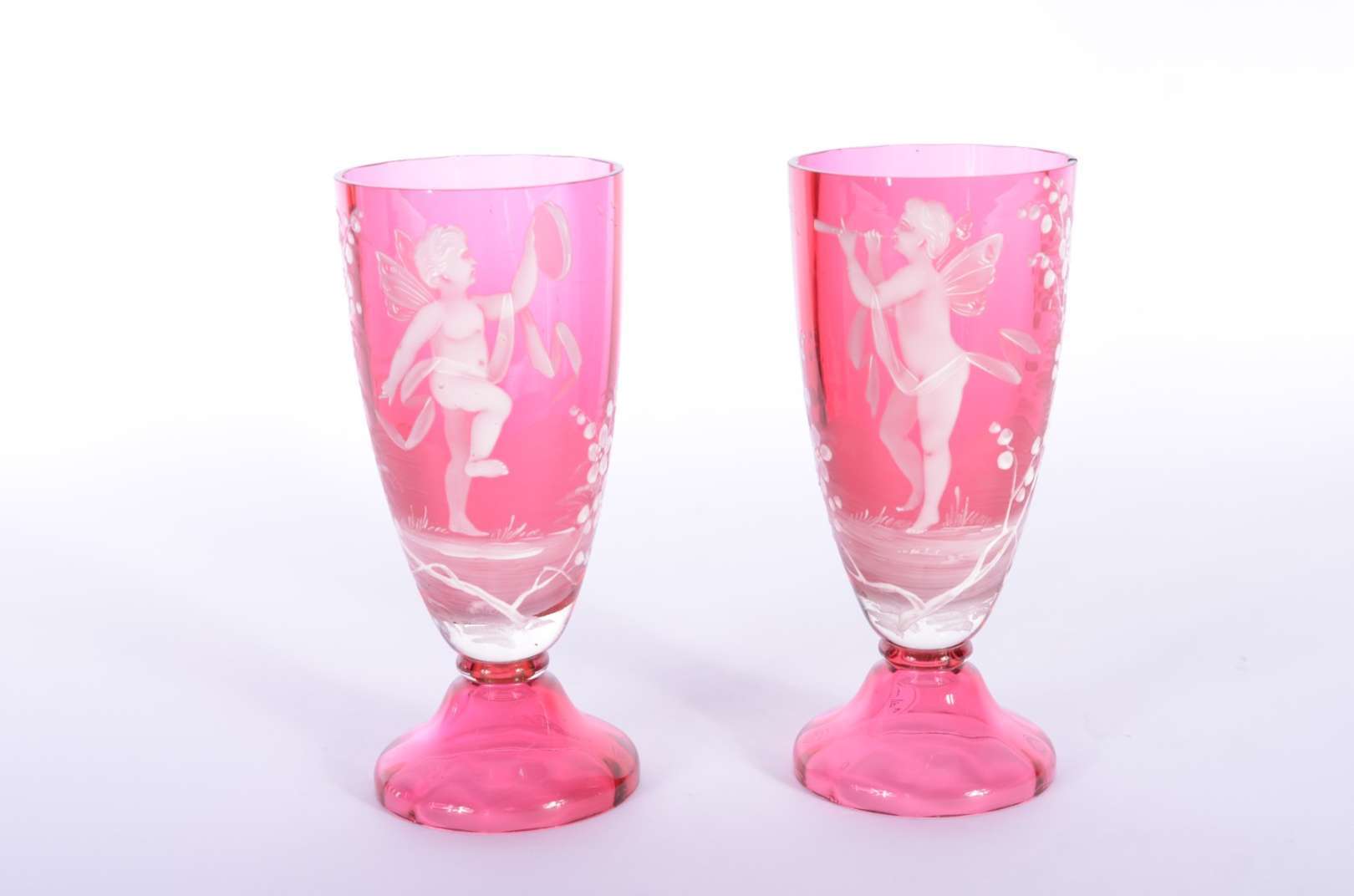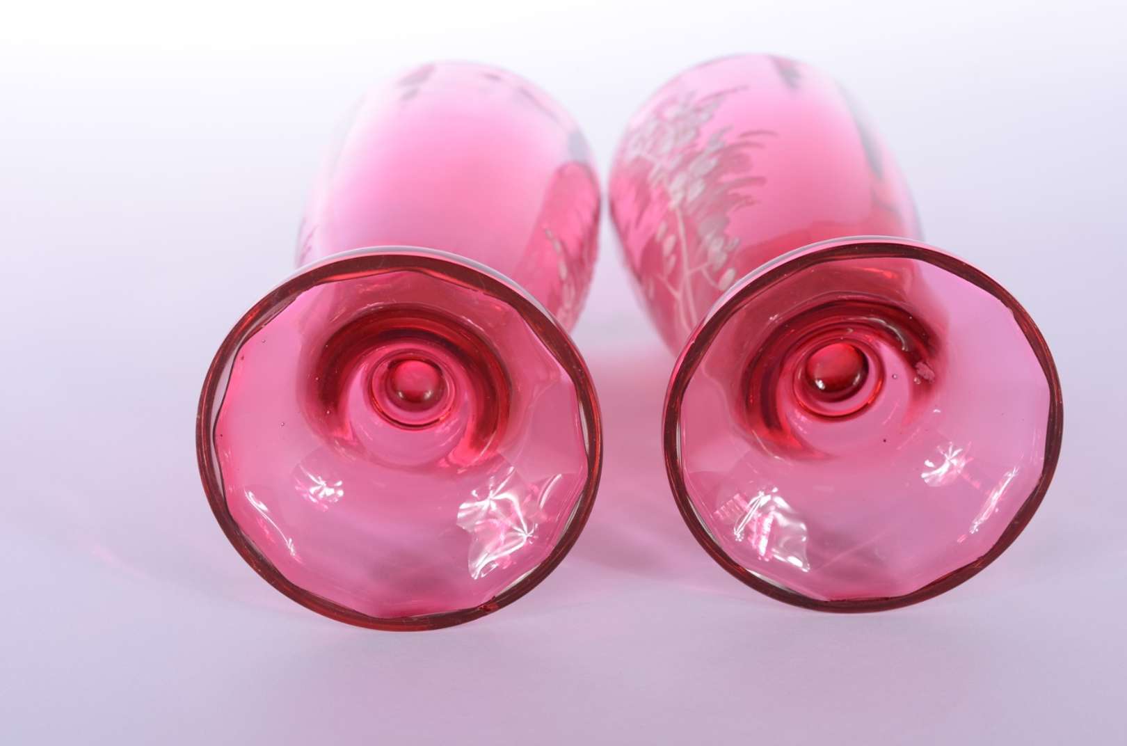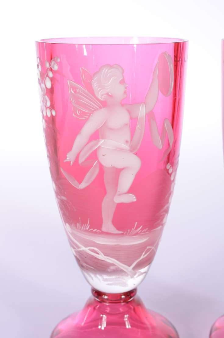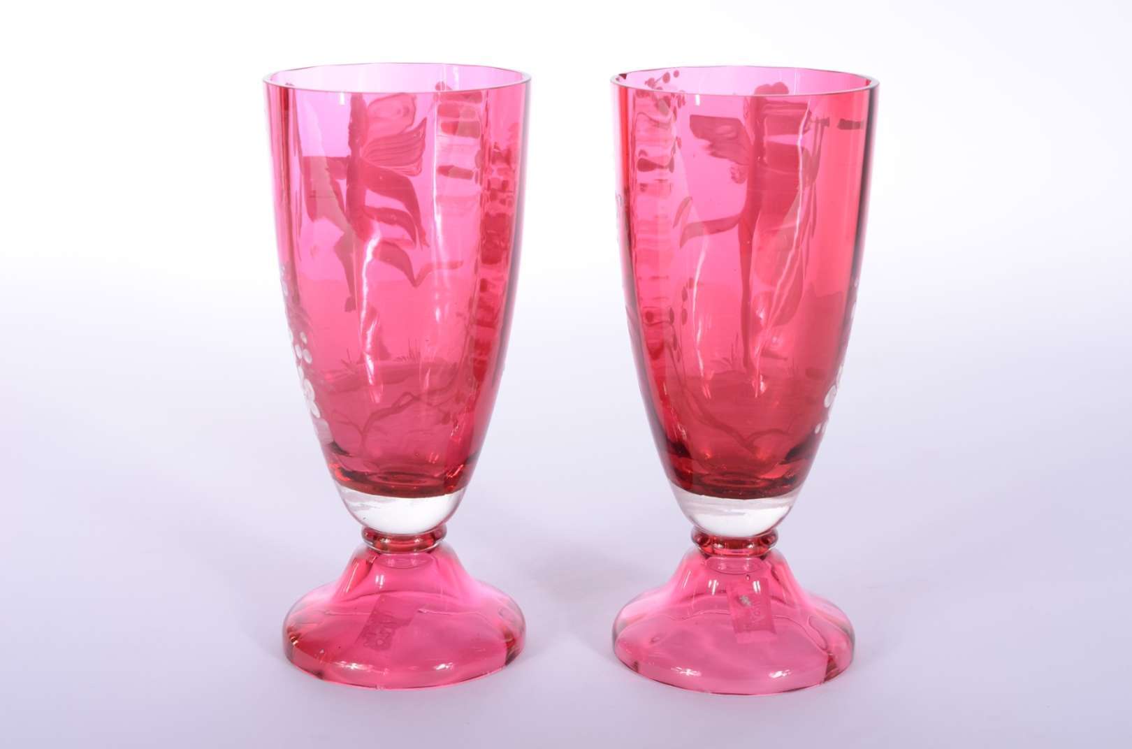 Diversas peças, sendo: conjunto com 6 copos de vidro vermelho e, vaso decorativo de vidro fosco degradé com "serpenti...