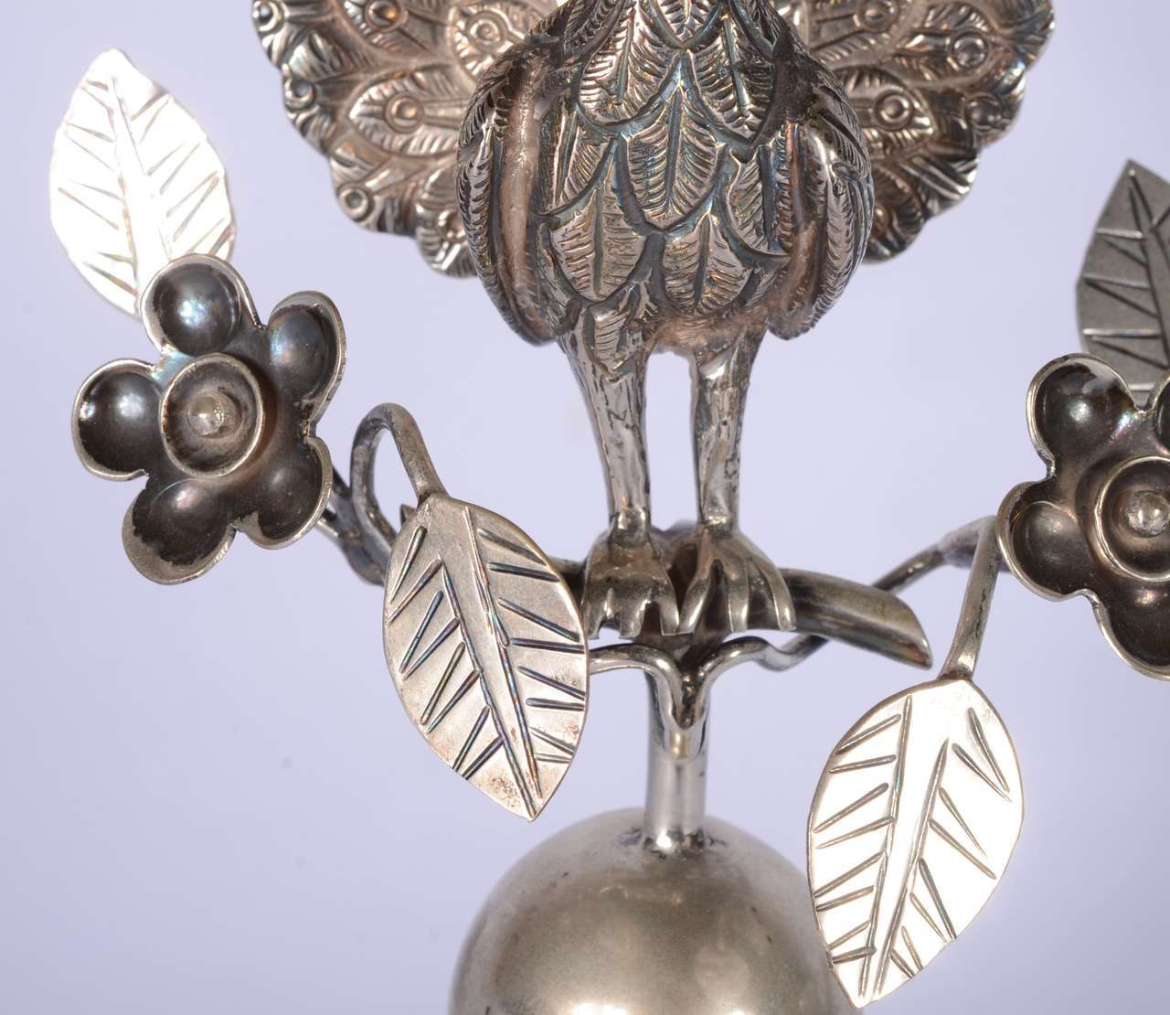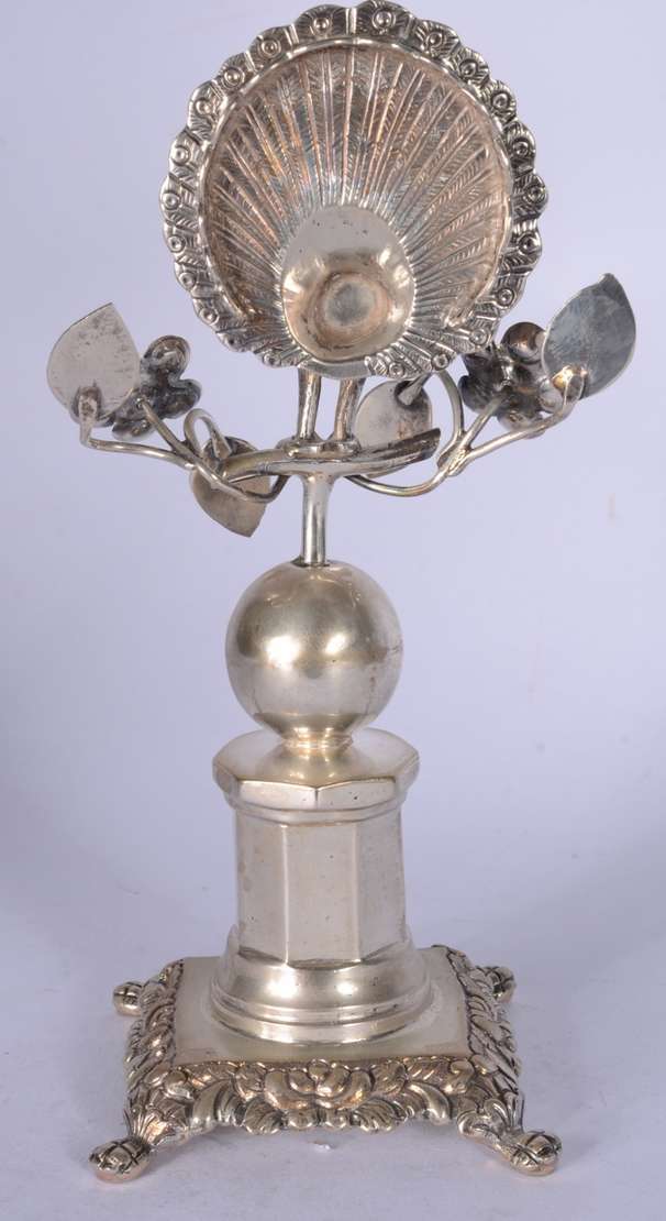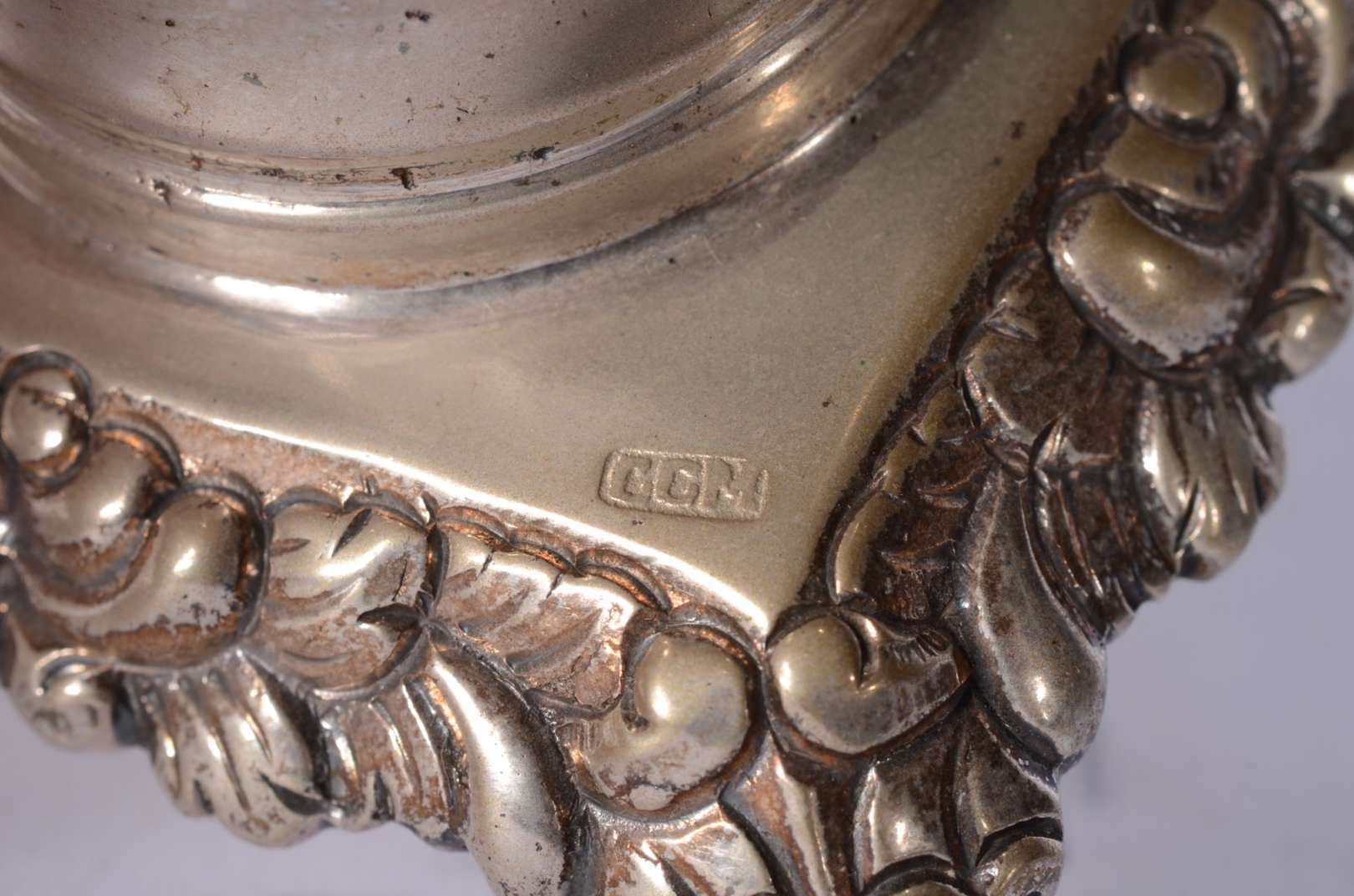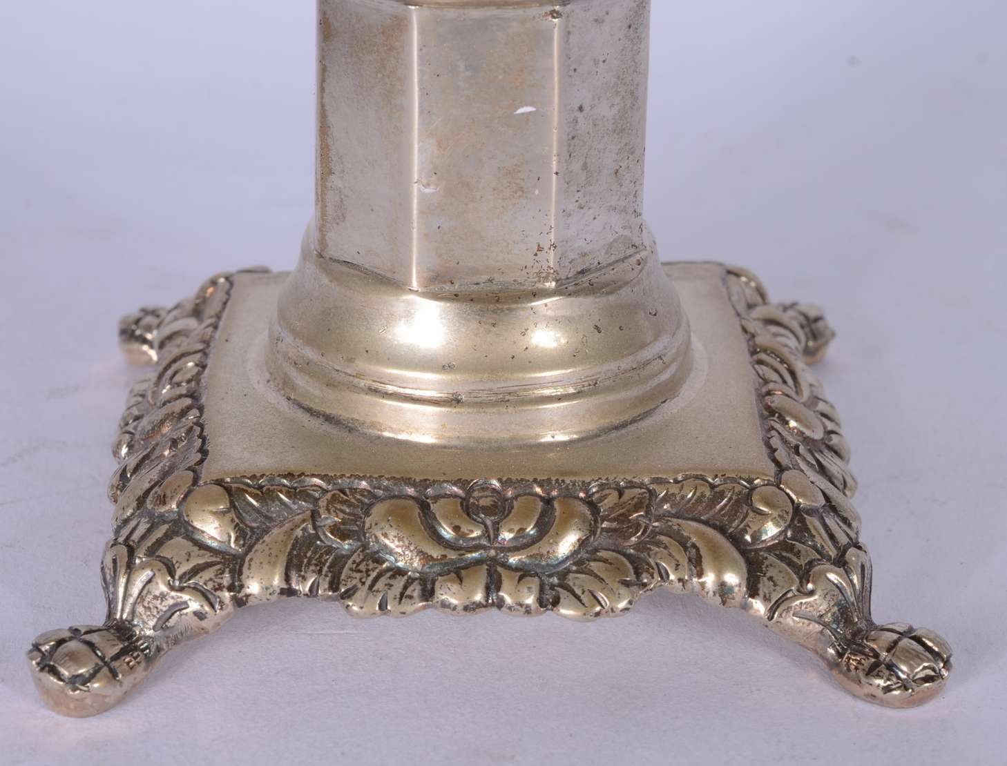 Quatro peças de metal prateado, sendo: floreira com tulipas, prato de pé alto; par de castiçais e vaso oitavado.