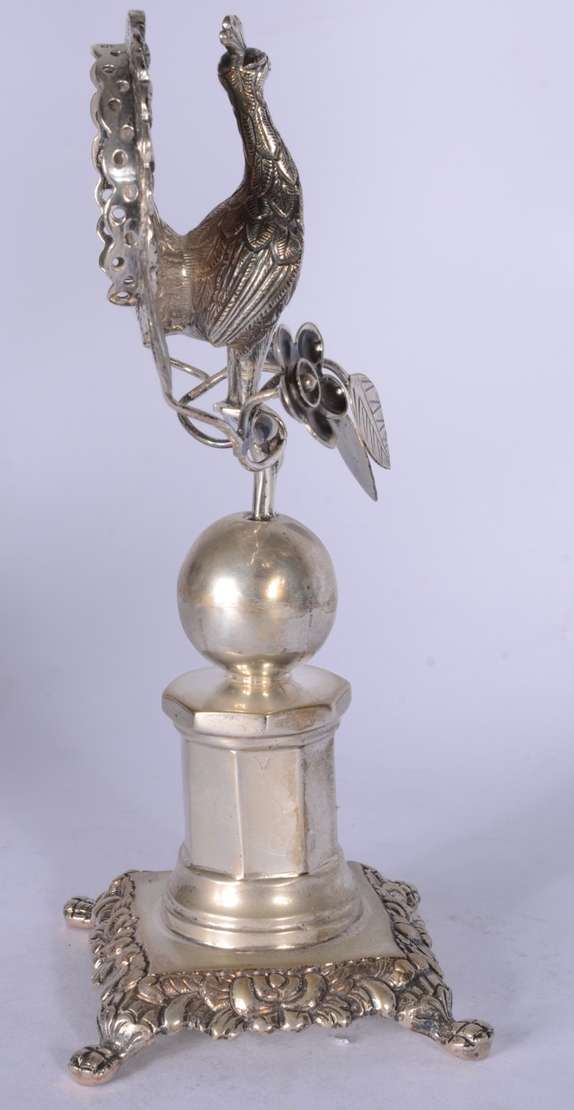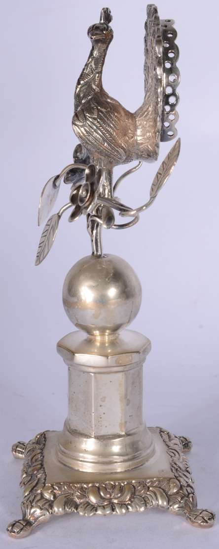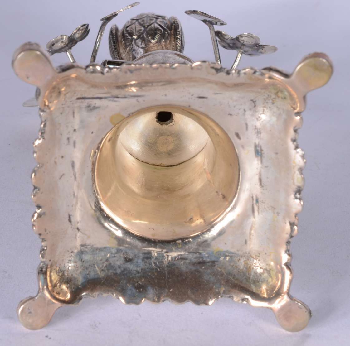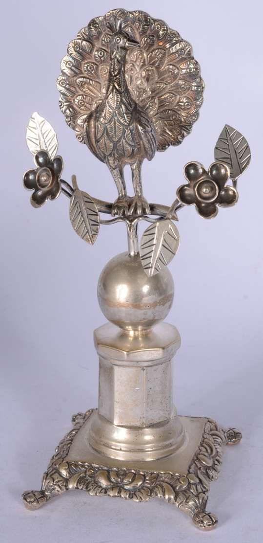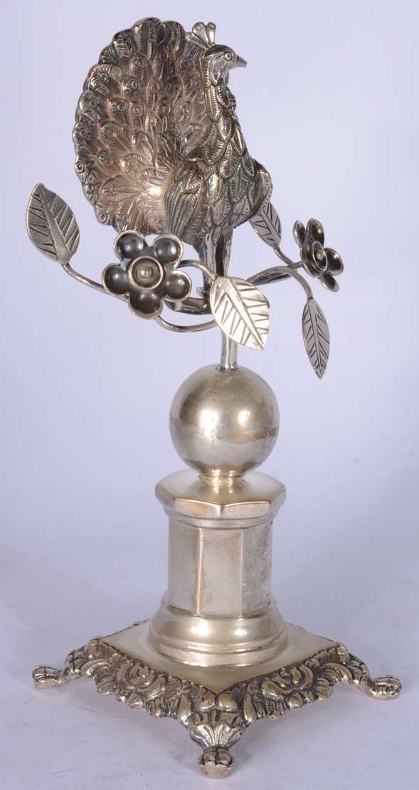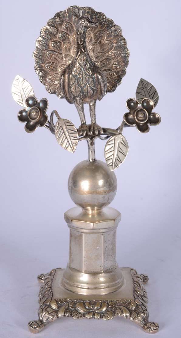 Quatro peças de metal prateado, sendo: floreira com tulipas, prato de pé alto; par de castiçais e vaso oitavado.