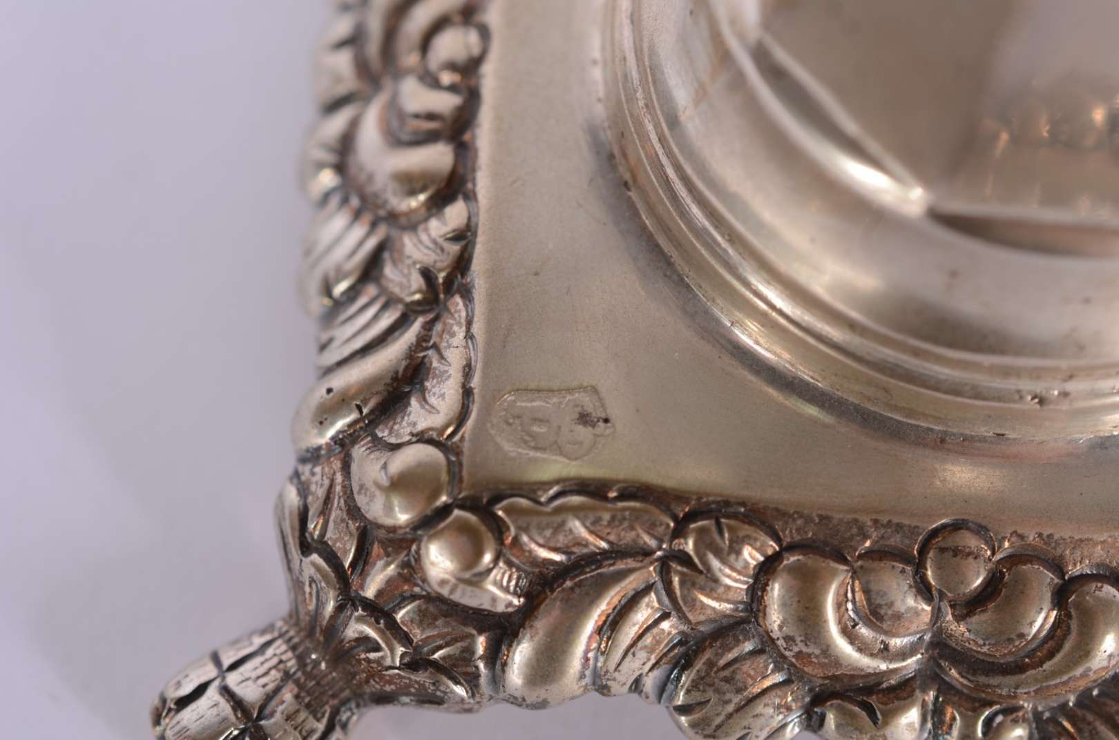Duas fruteiras de cristal europeu lapidado, guarnição de metal prateado.