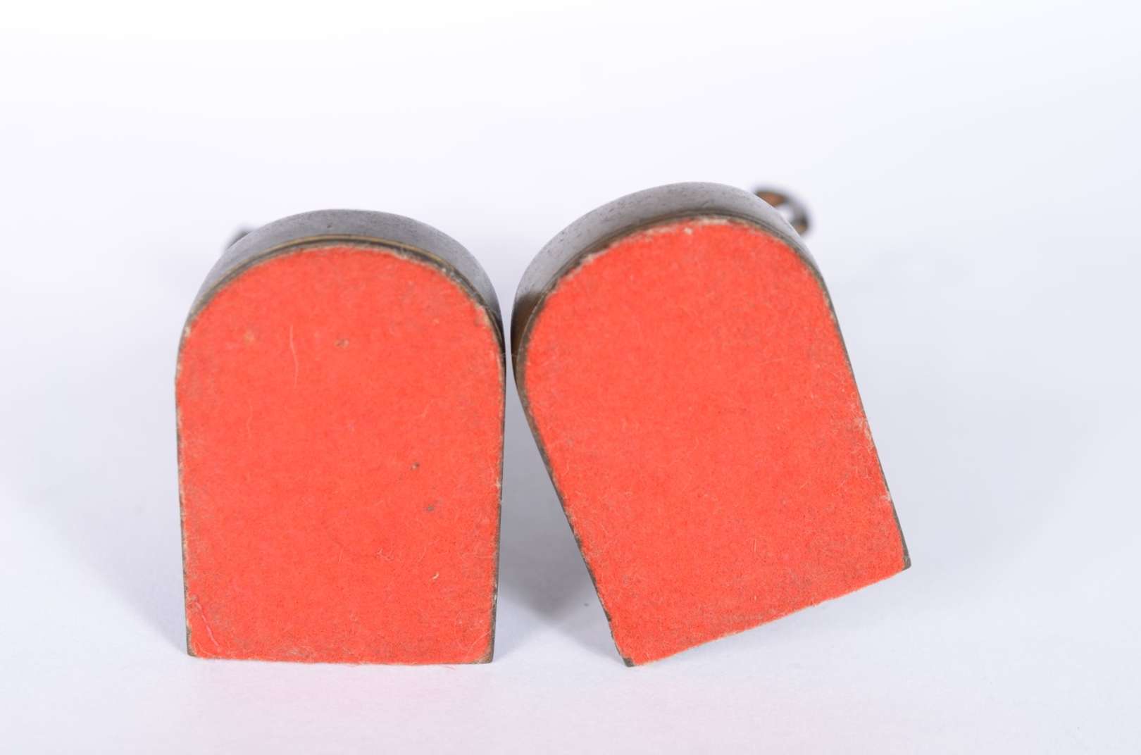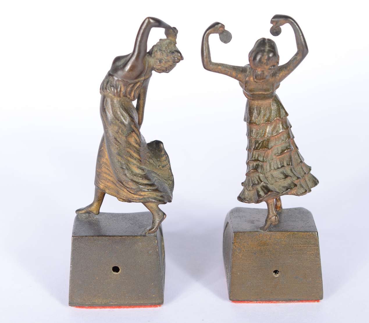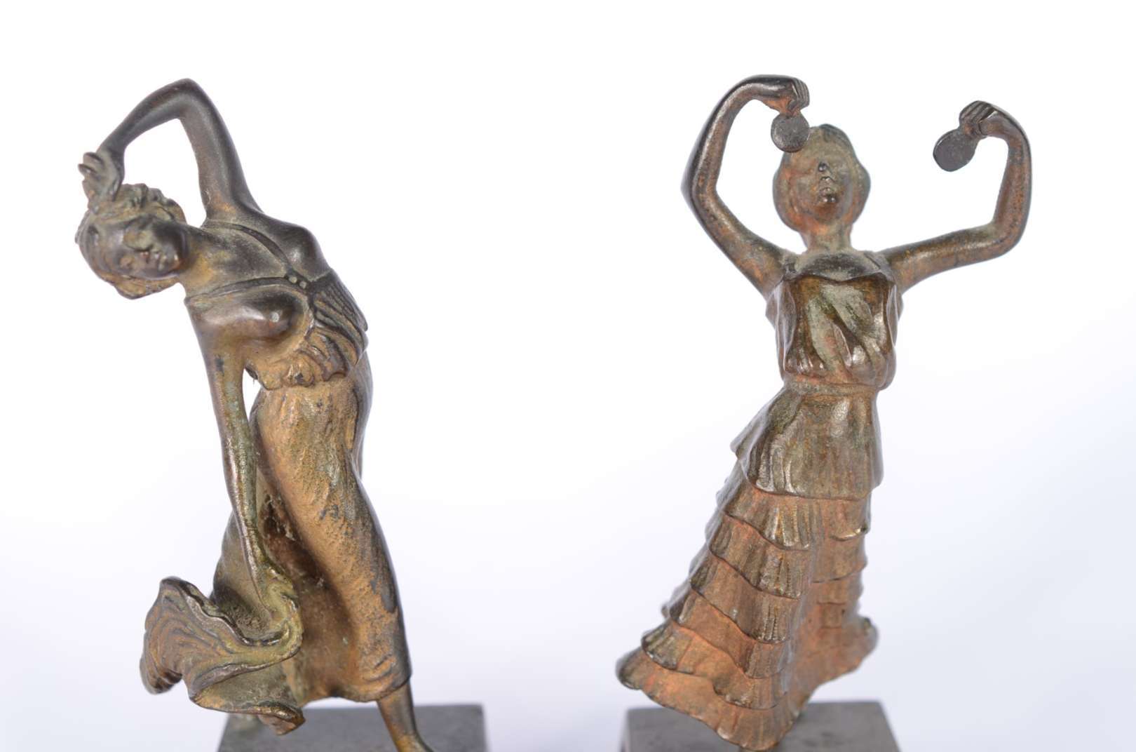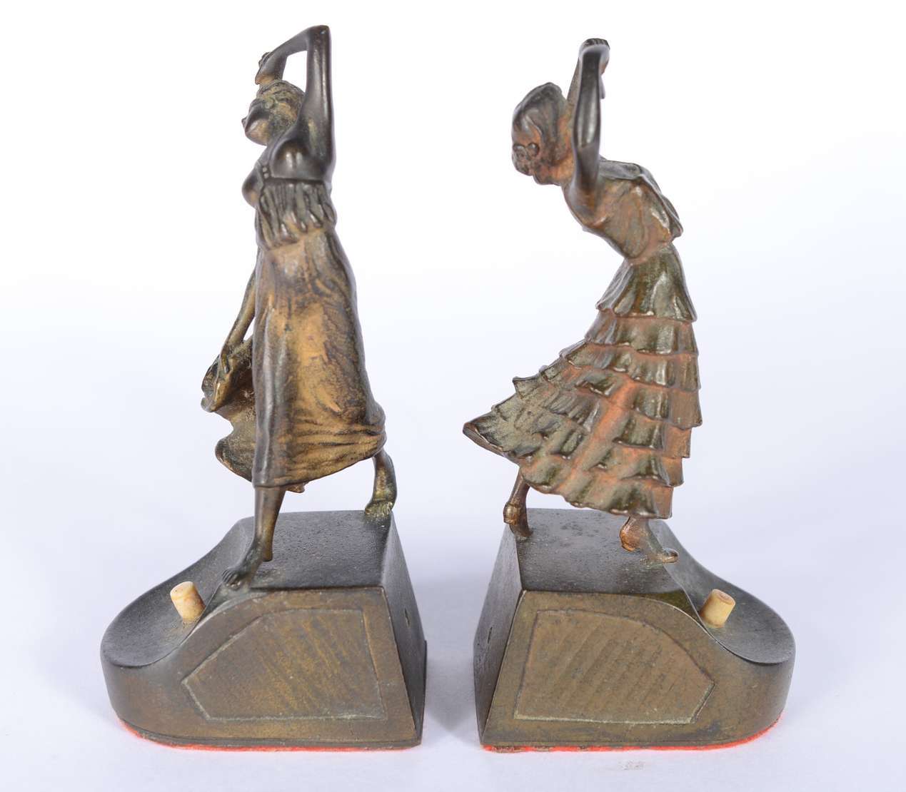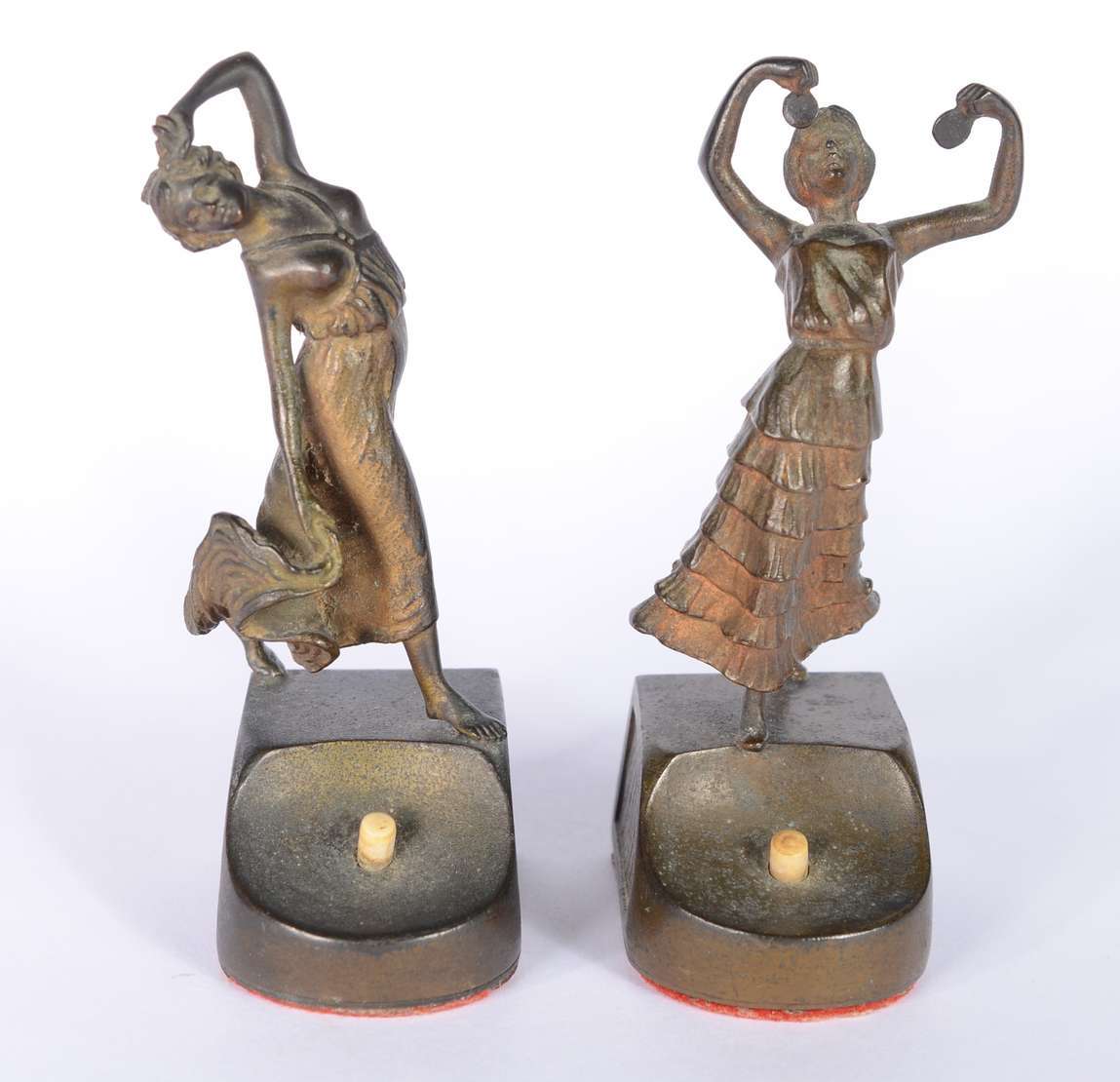 Par de pequenas esculturas europeias de metal representando "dançarinas". Eram utilizadas como bases para abatjoures. Pequenos desgastes.
