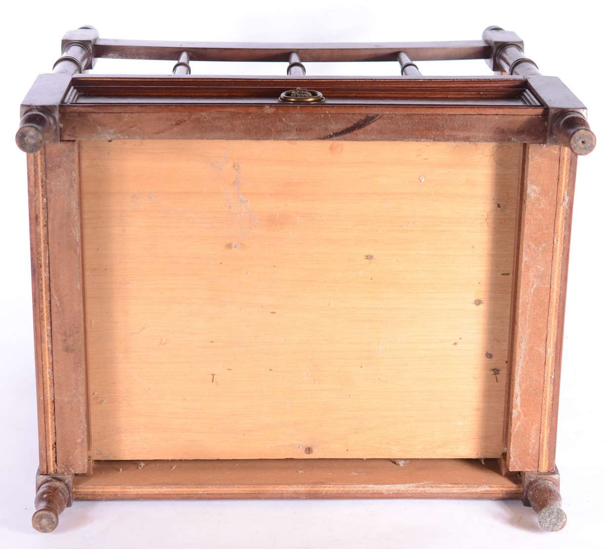 Mesa auxiliar de madeira ebanizada, platô inferior com gavetinha, pernas cilíndricas e ponteiras de bronze.