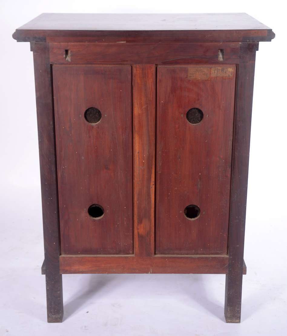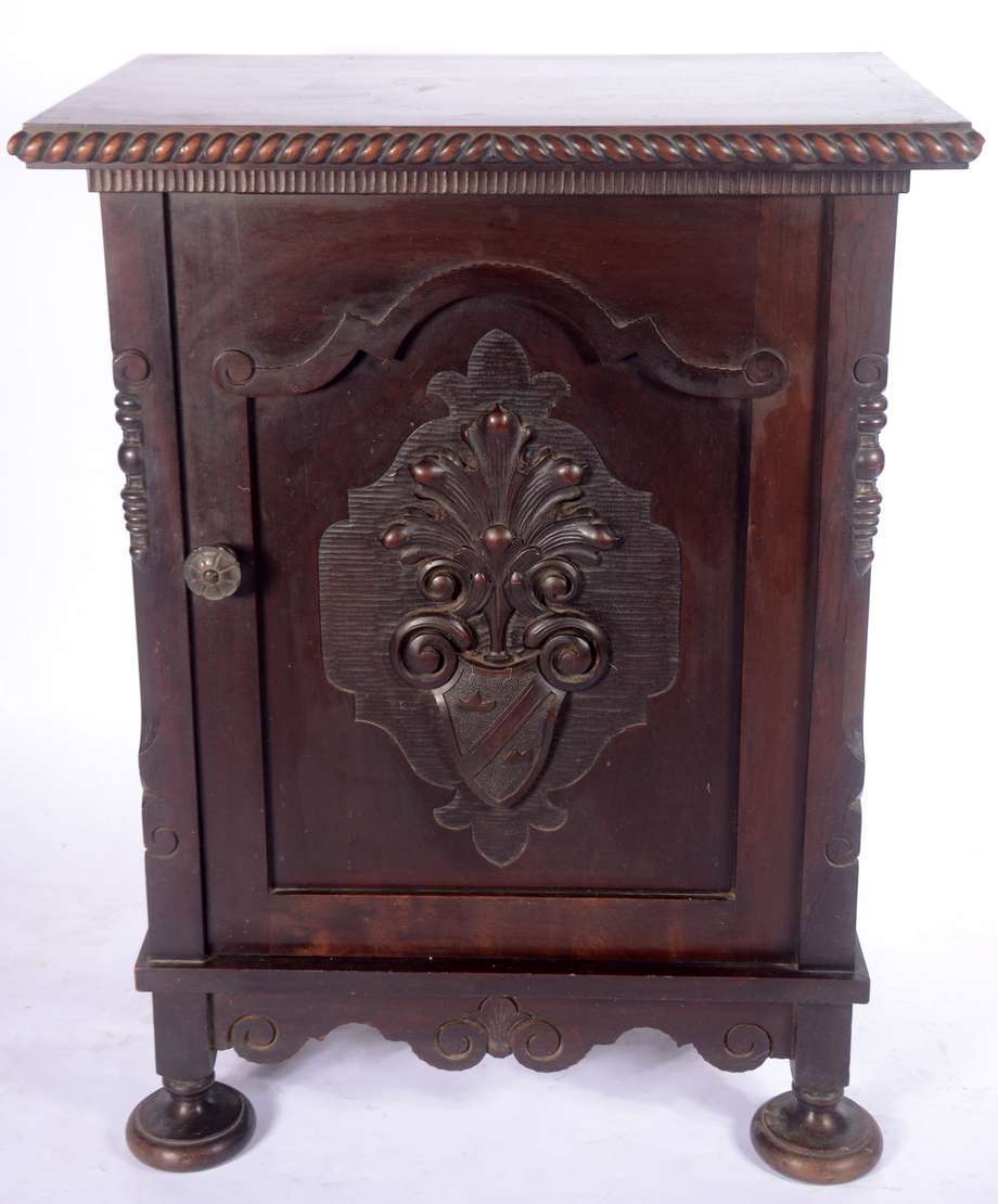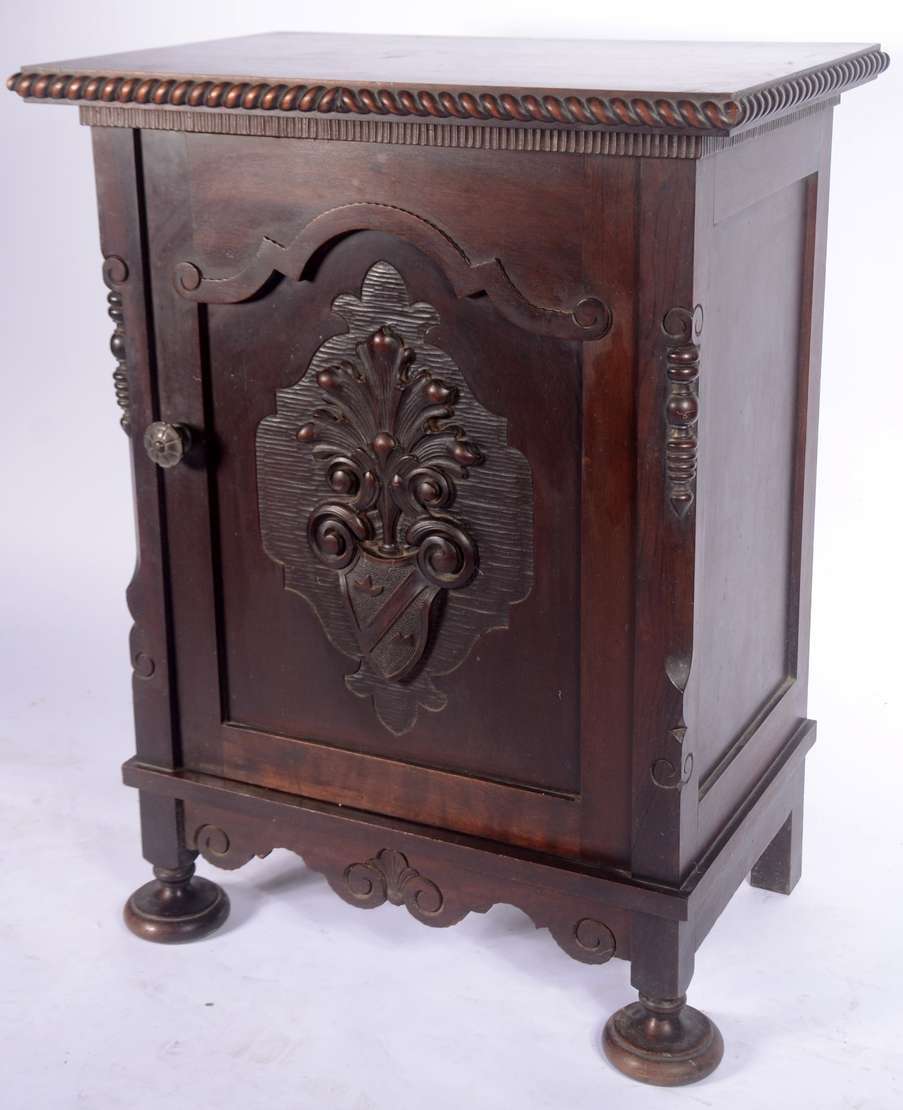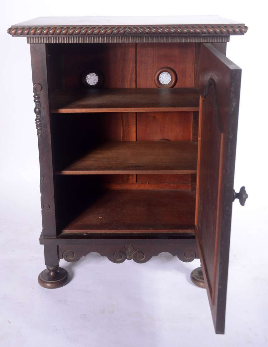 Móvel auxiliar de madeira nobre, porta decorada com florão entalhado, prateleiras internas. Saia recortada e pés de bolacha. Quatro orifícios no forro posterior.