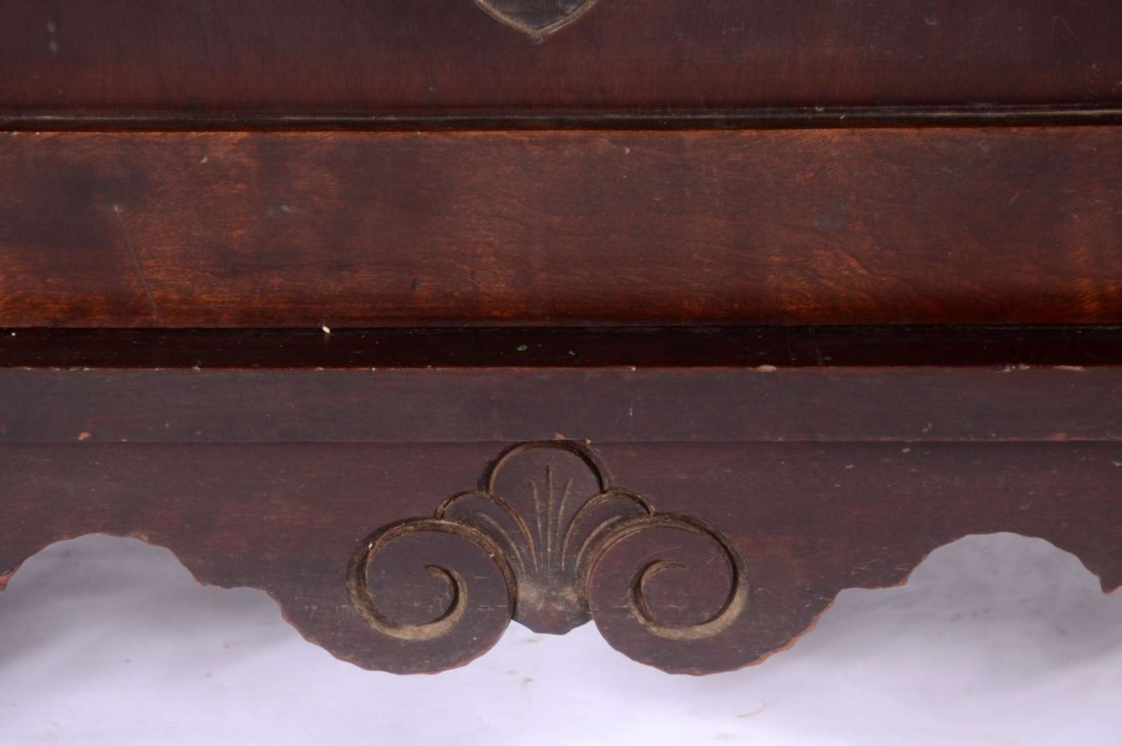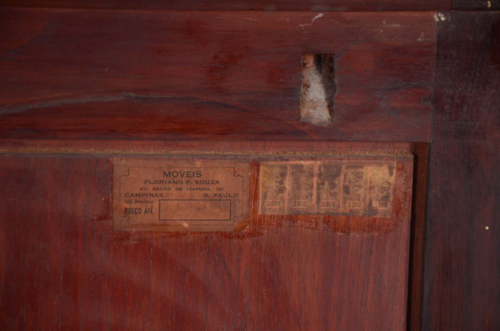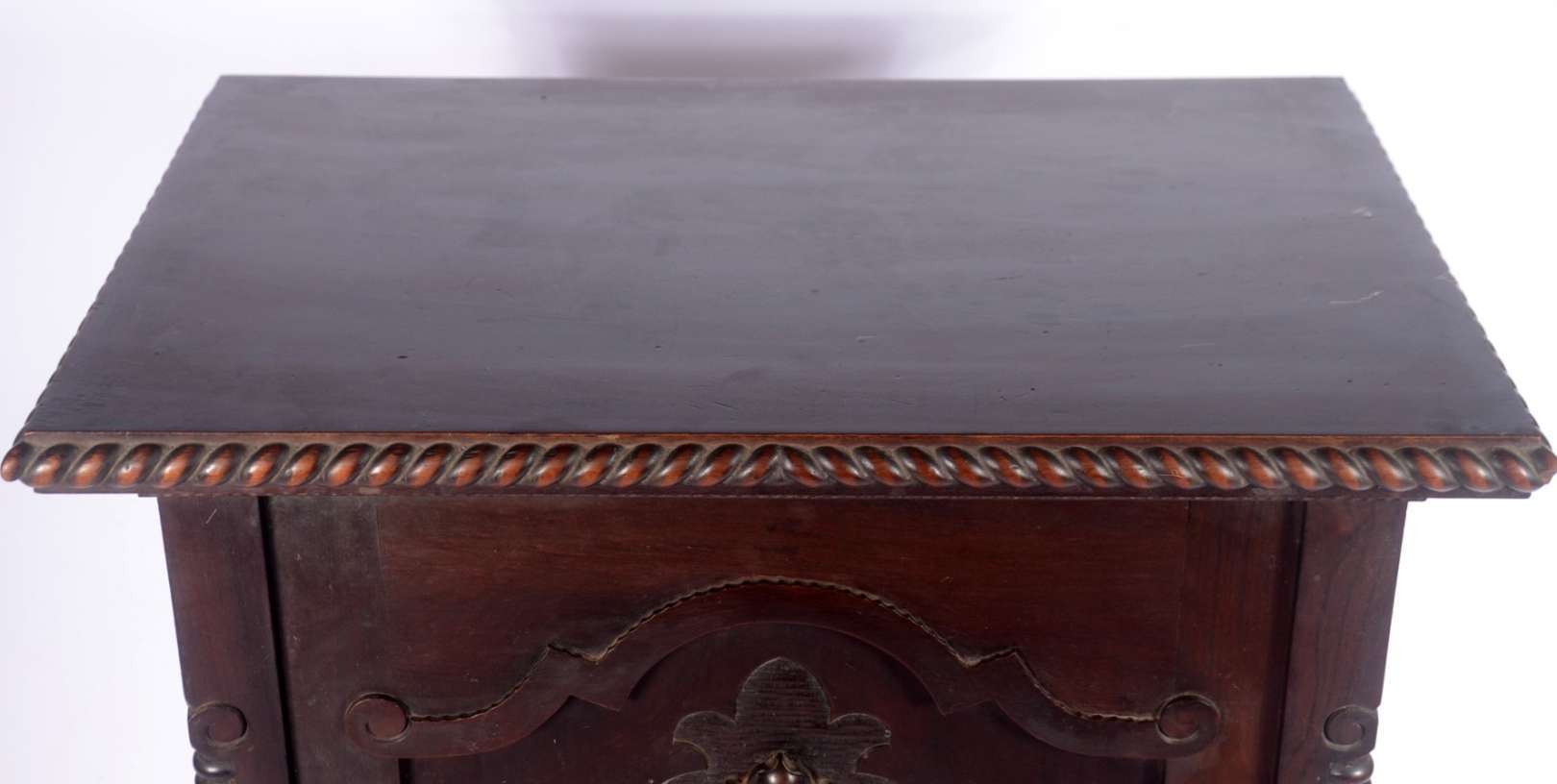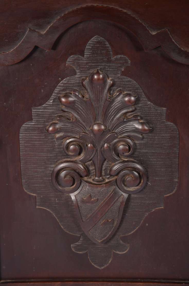 Móvel auxiliar de madeira nobre, porta decorada com florão entalhado, prateleiras internas. Saia recortada e pés de bolacha. Quatro orifícios no forro posterior.