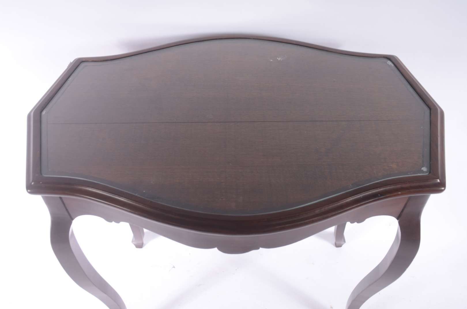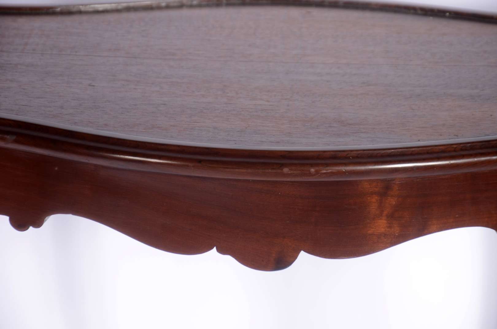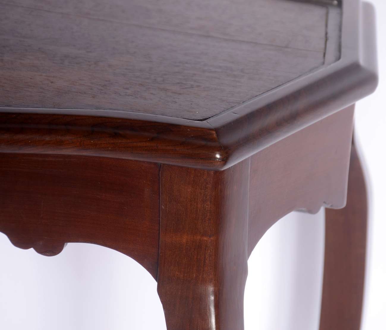 Mesa auxiliar "Cake table" de madeira nobre com 2 platôs, bordas recortadas e base na forma de tripé.