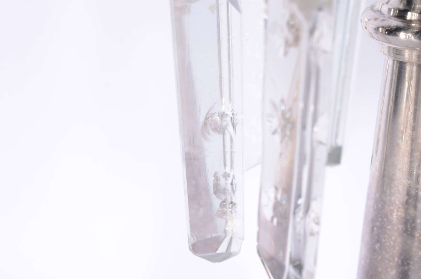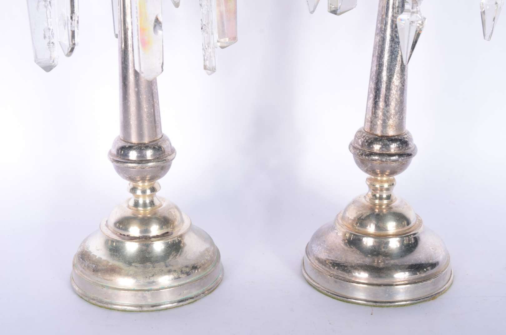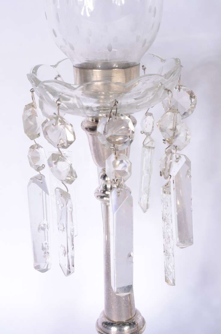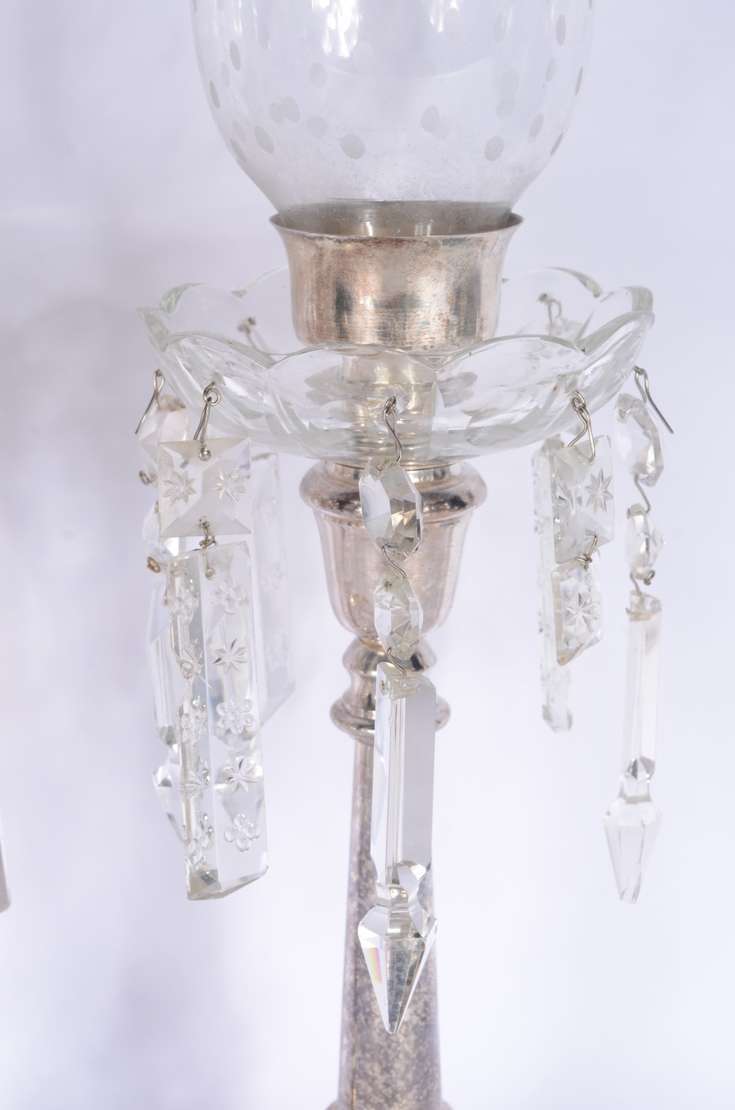 Par de candelabros de metal prateado para 5 velas cada, bobeches de cristal. Desgastes.