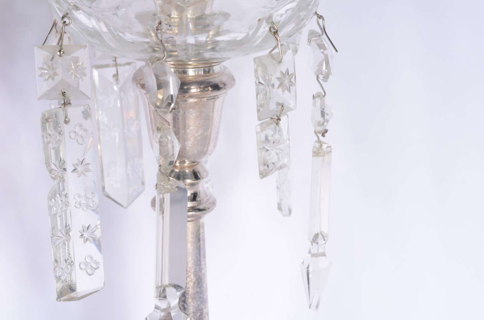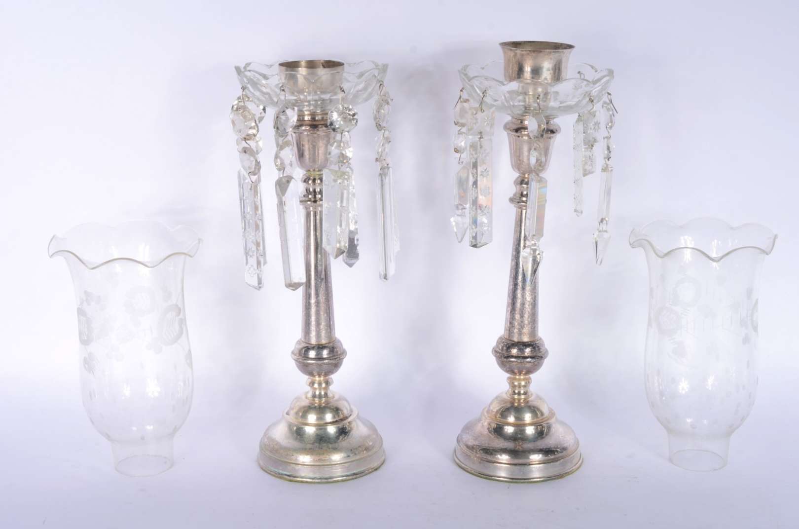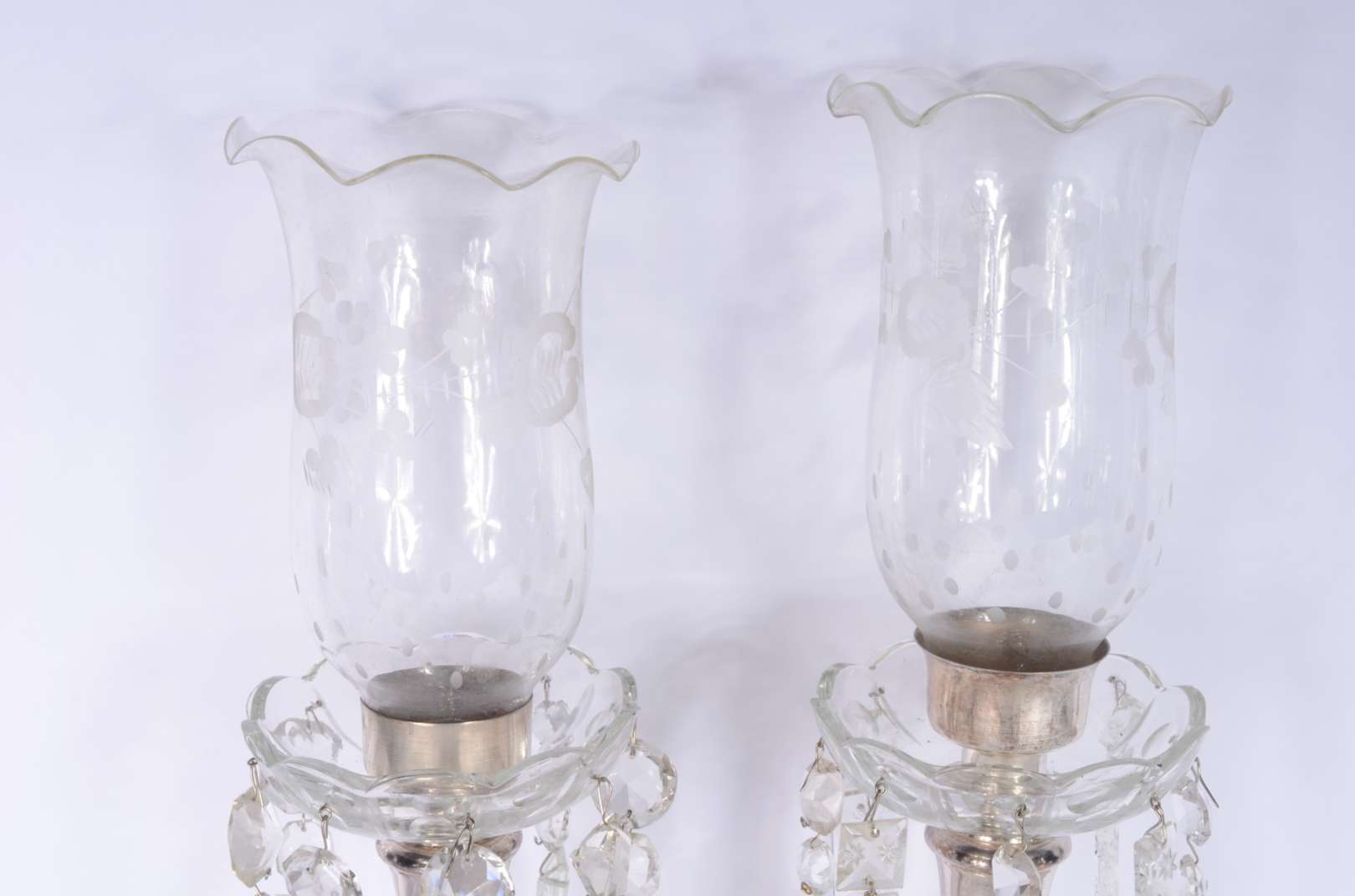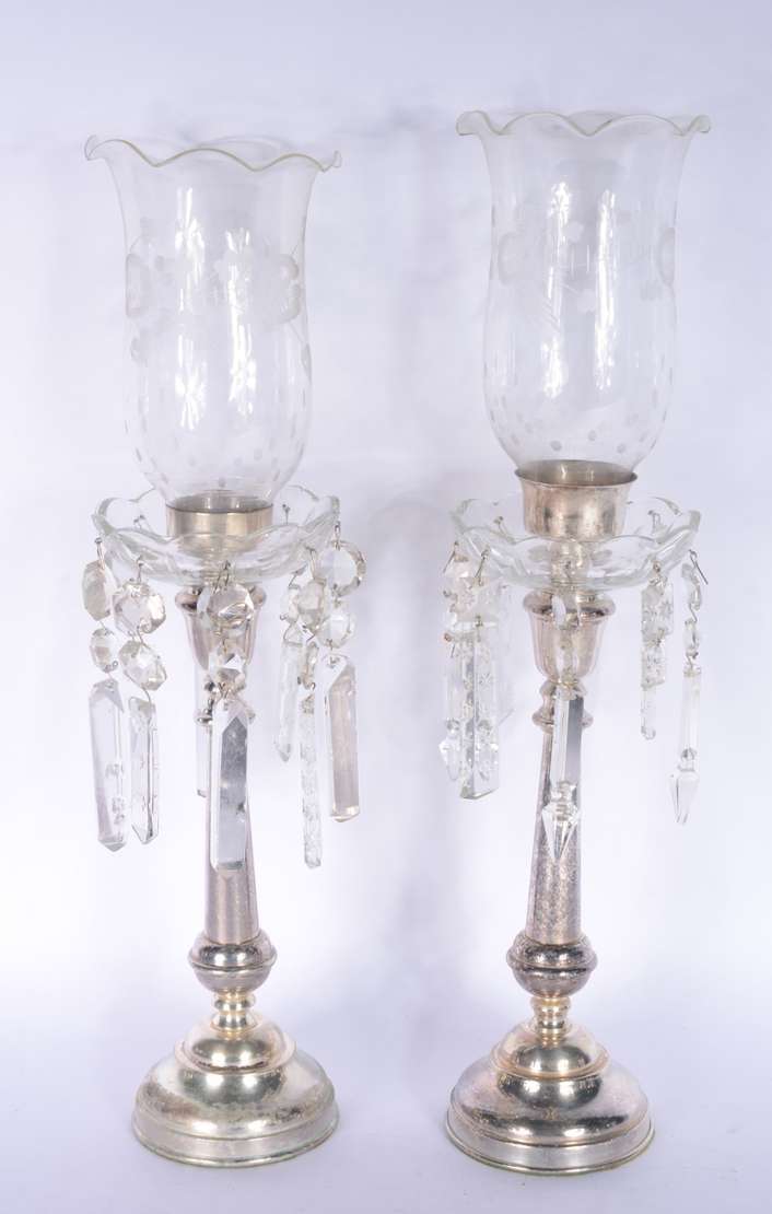 Par de candelabros de metal prateado para 5 velas cada, bobeches de cristal. Desgastes.