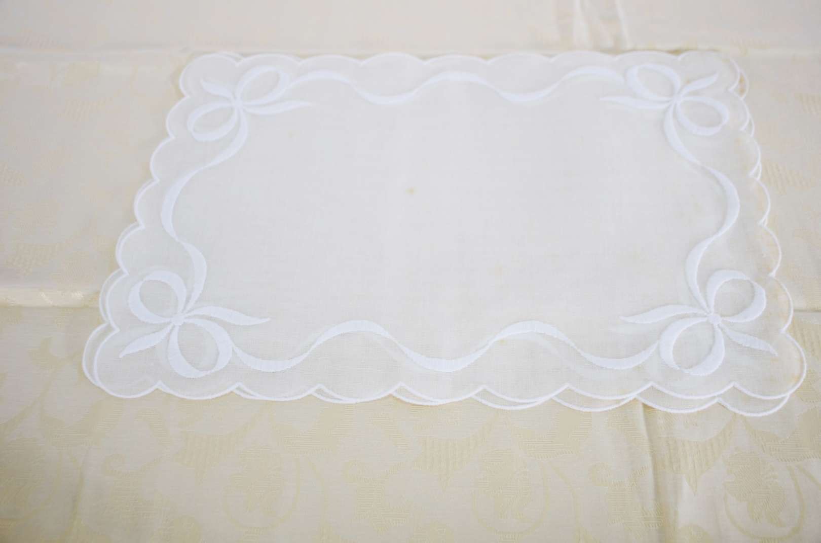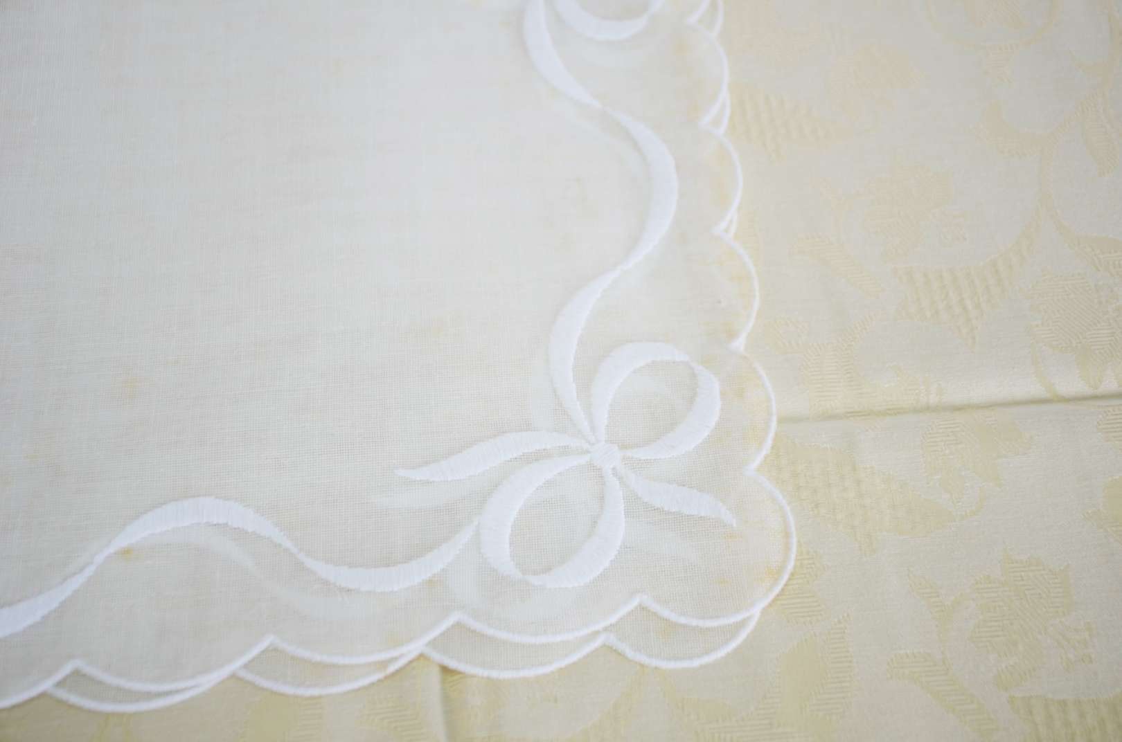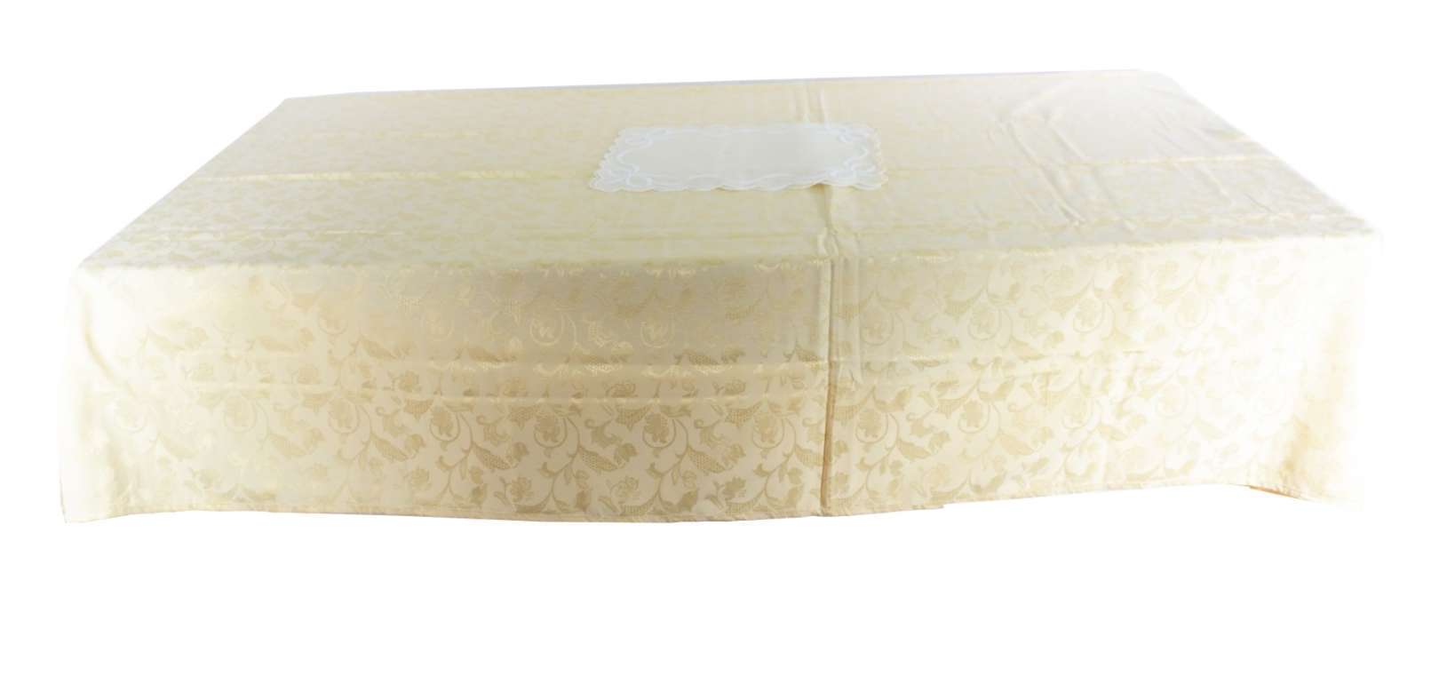 Toalha de mesa na cor bege com bordados, acompanham 12 guardanapos.