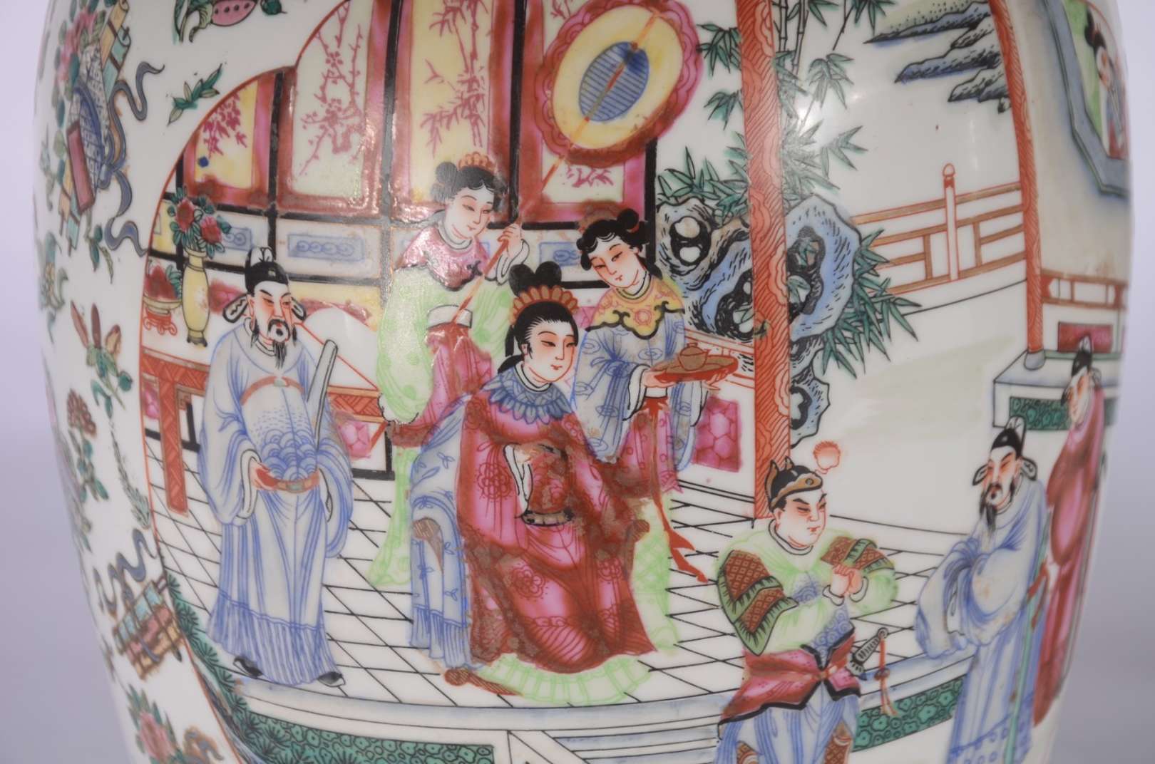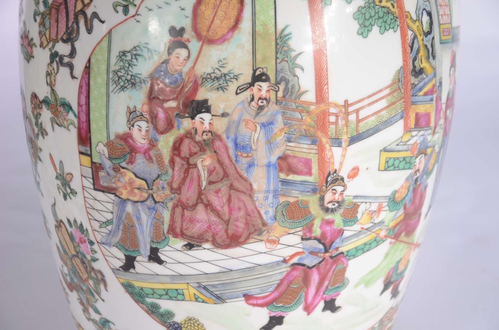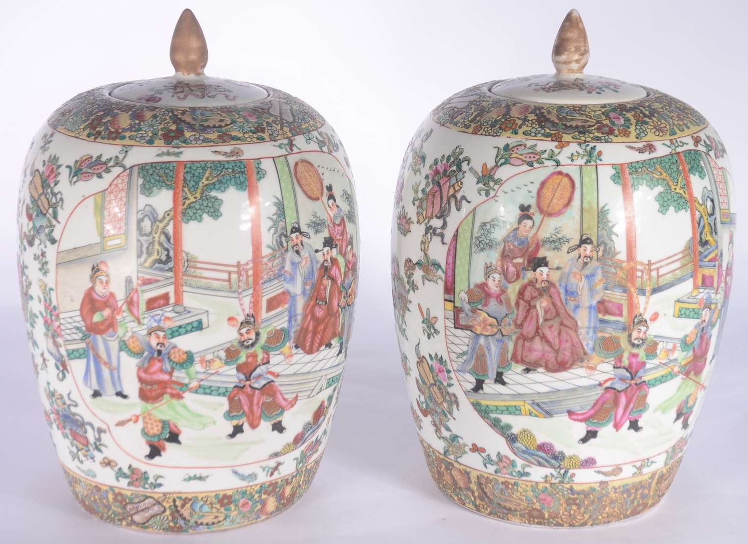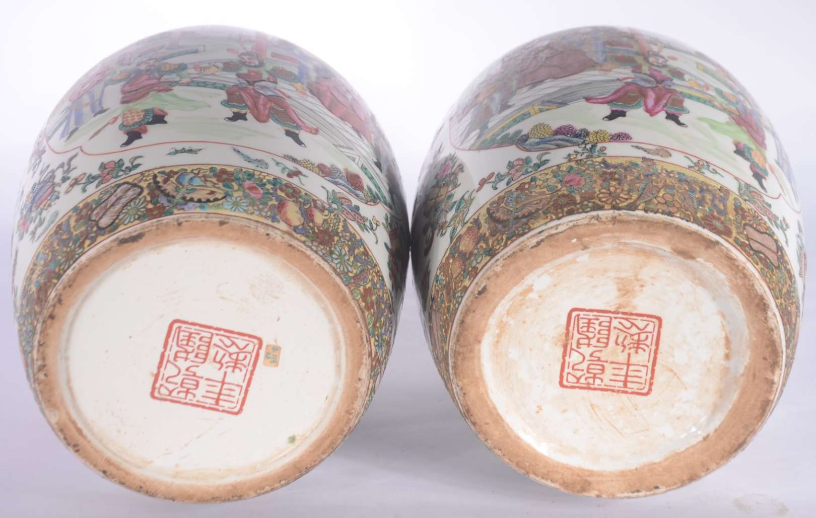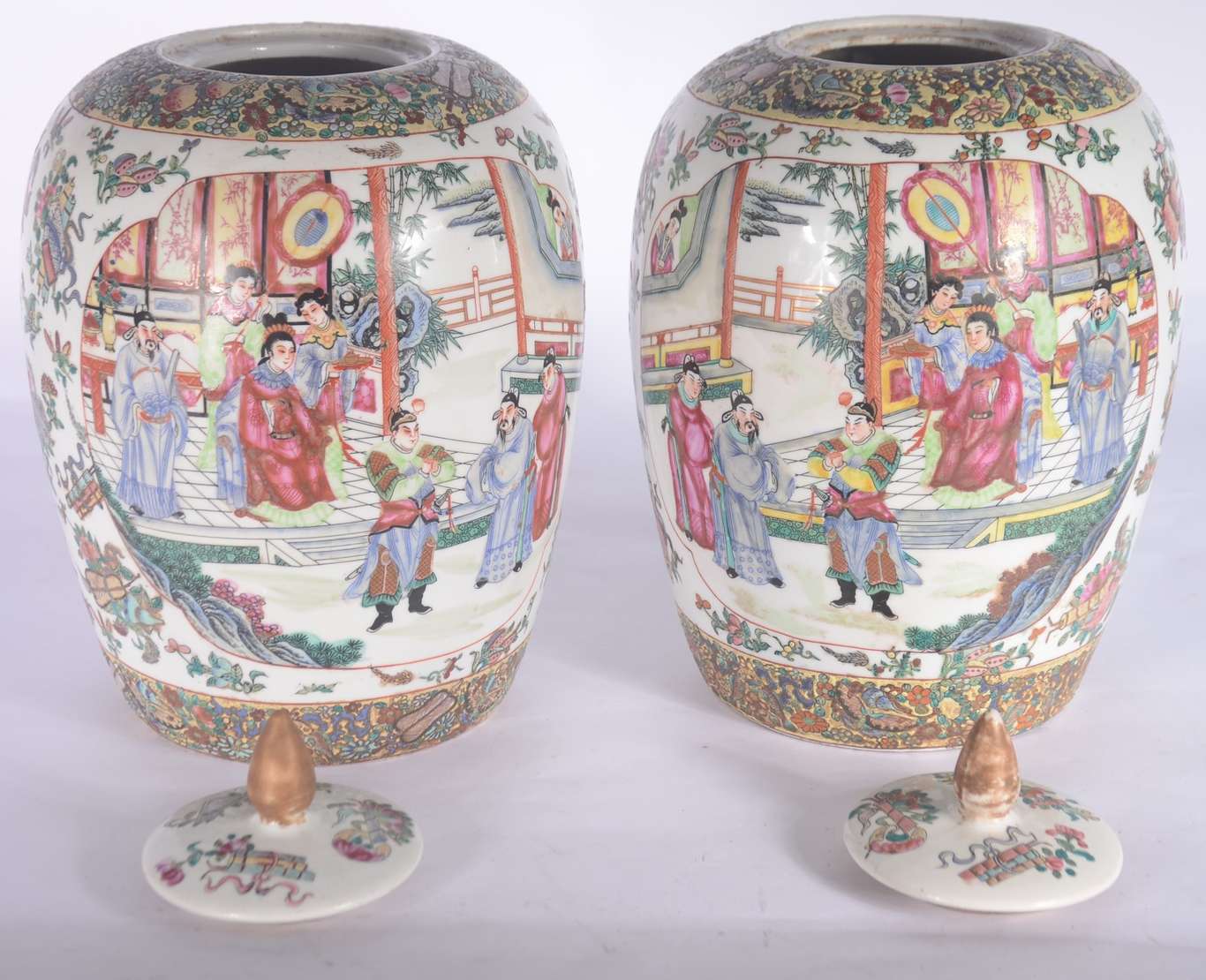 Par de cachepots com pratos de porcelana chinesa pais em policromia.