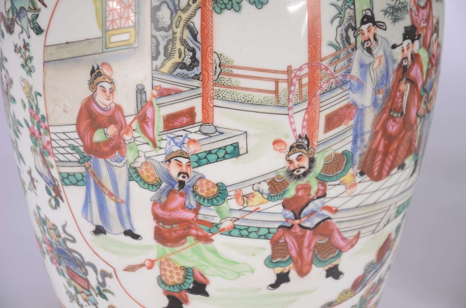 Três cachepots de porcelana chinesa, decorações com pássaros e flores em policromia.