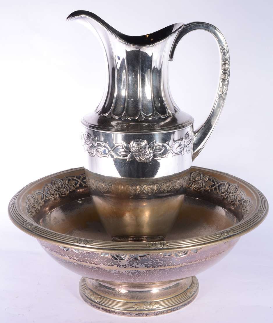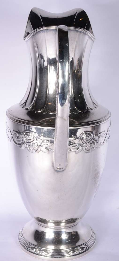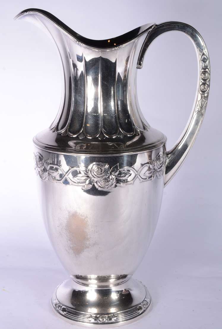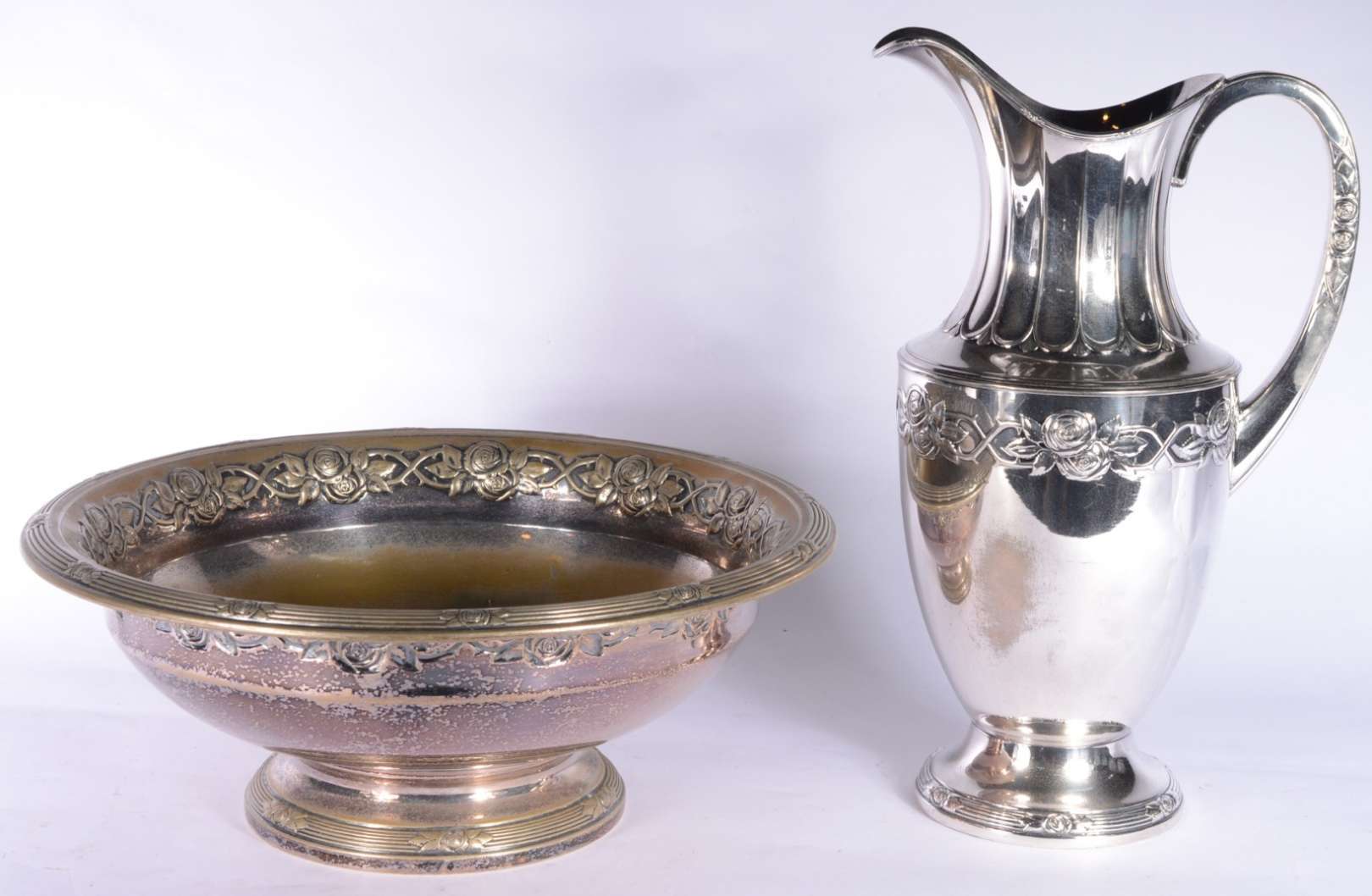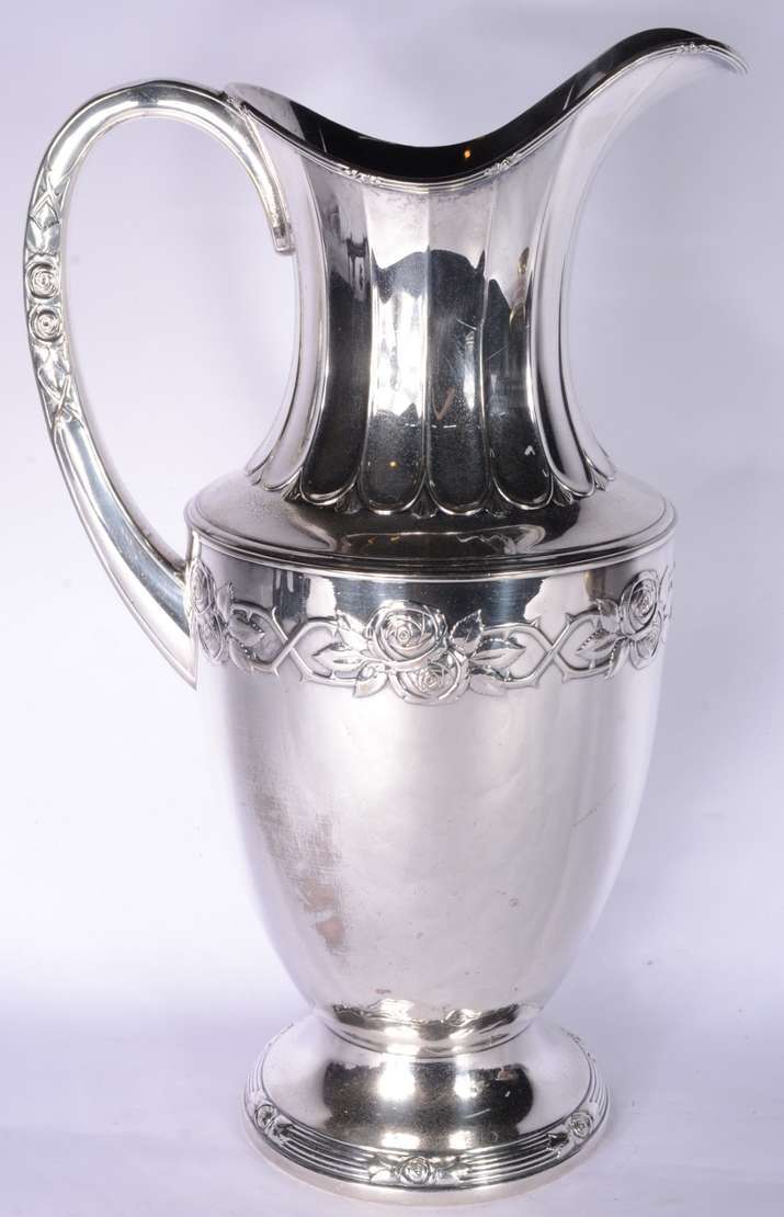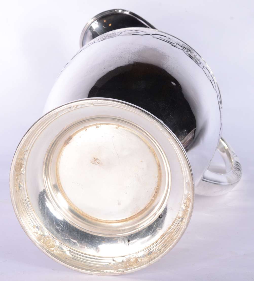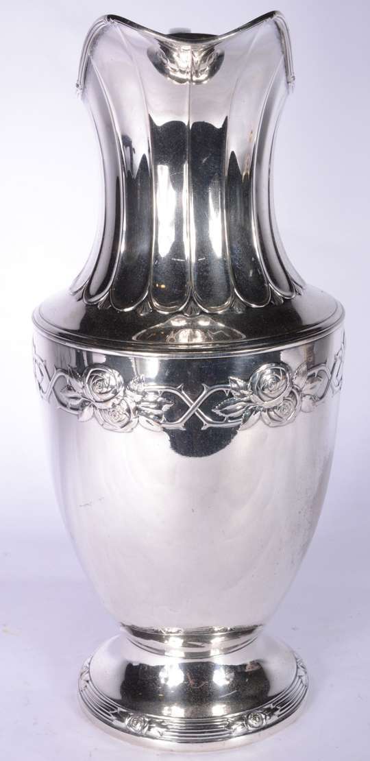 Quatro peças de metal prateado, sendo: floreira com tulipas, prato de pé alto; par de castiçais e vaso oitavado.