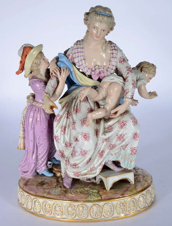 Grupo escultórico de porcelana alemã Meissen represando mão com crianças. Restauro no braço.