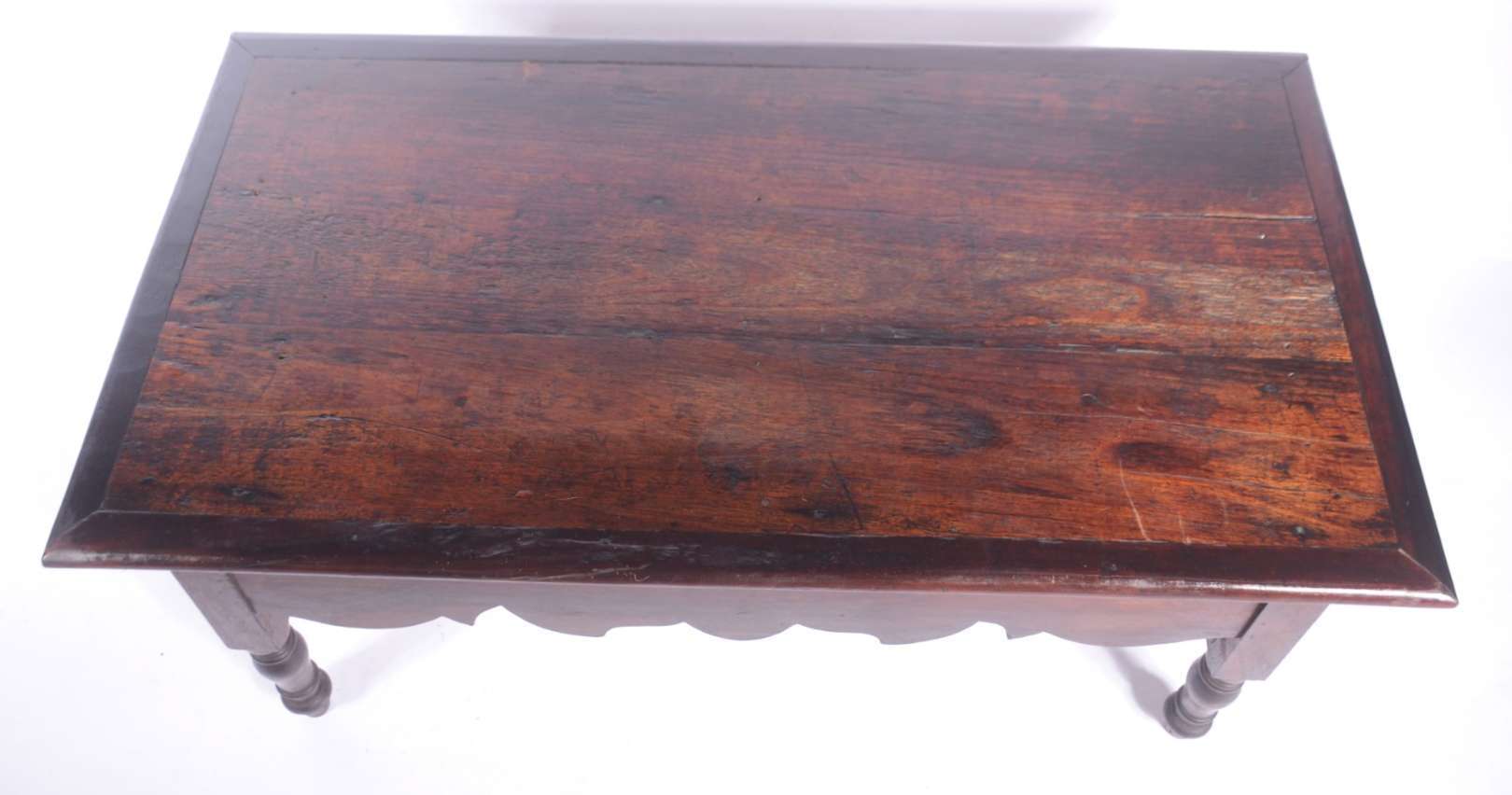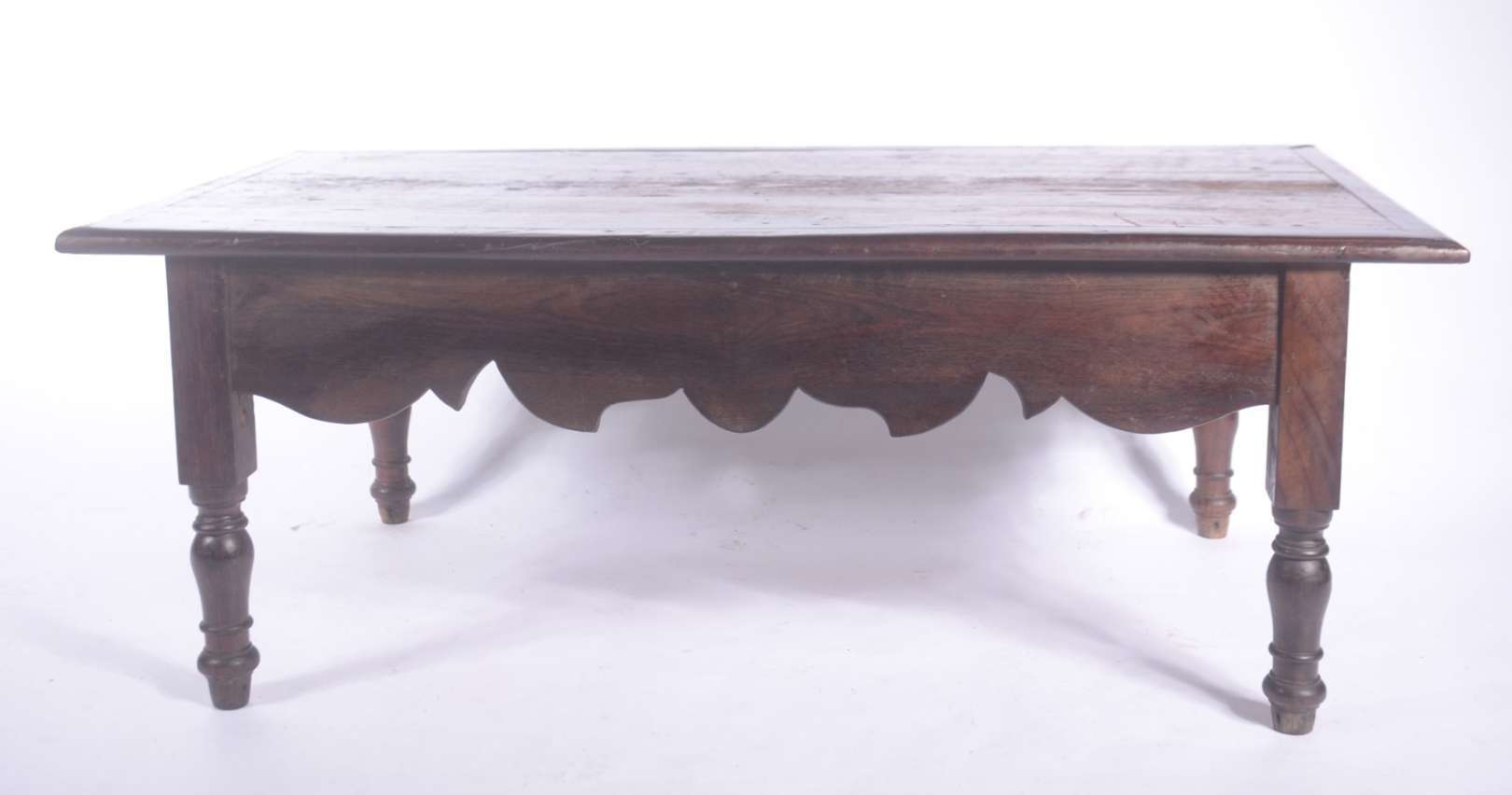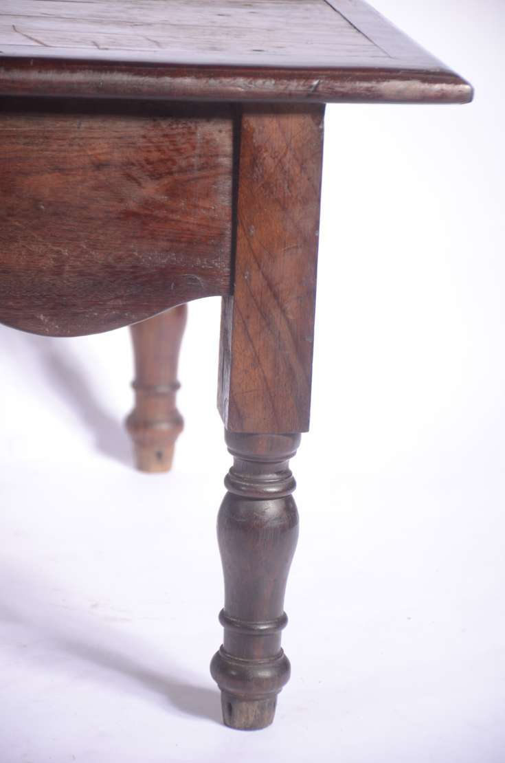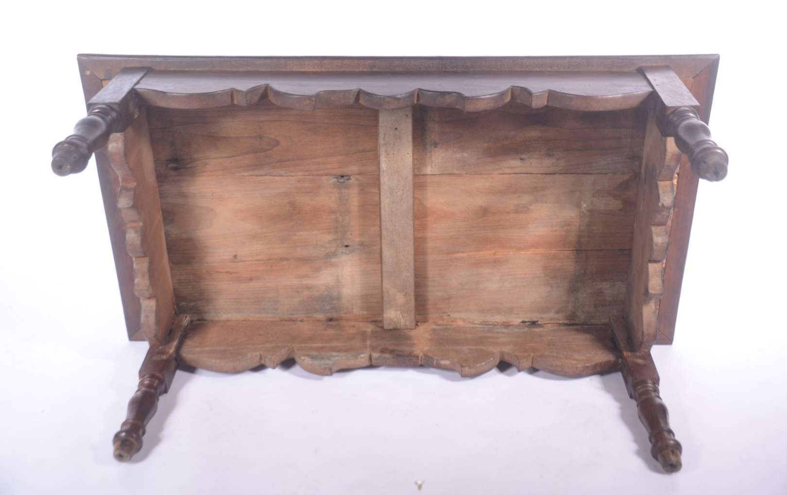 Mesa auxiliar de madeira nobre, feitio retangular, apoio em coluna central torneada terminando em quatro pernas recur...