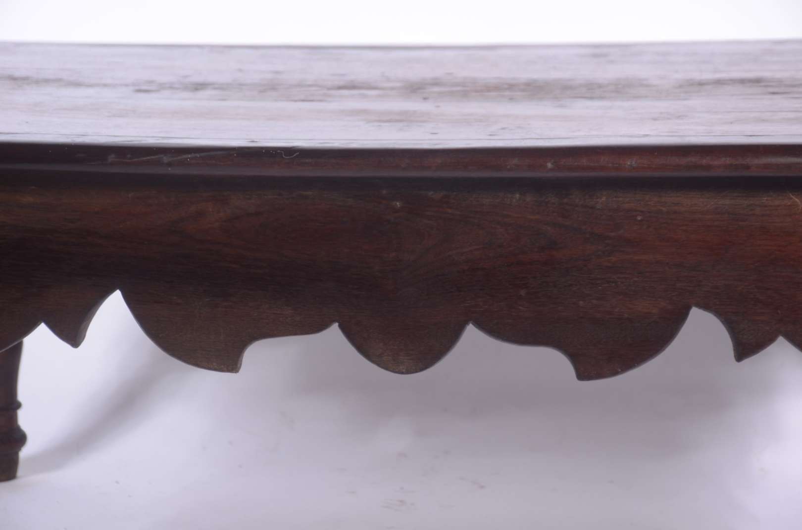 Banco/mocho de madeira nobre, saia recortada com entalhes, pernas recurvas. Pequenos desgastes na madeira.