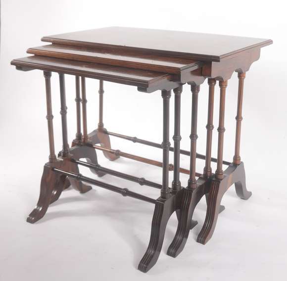 Mesa "ninho" de madeira nobre com 3 peças, pernas na forma de hastes torneadas.
