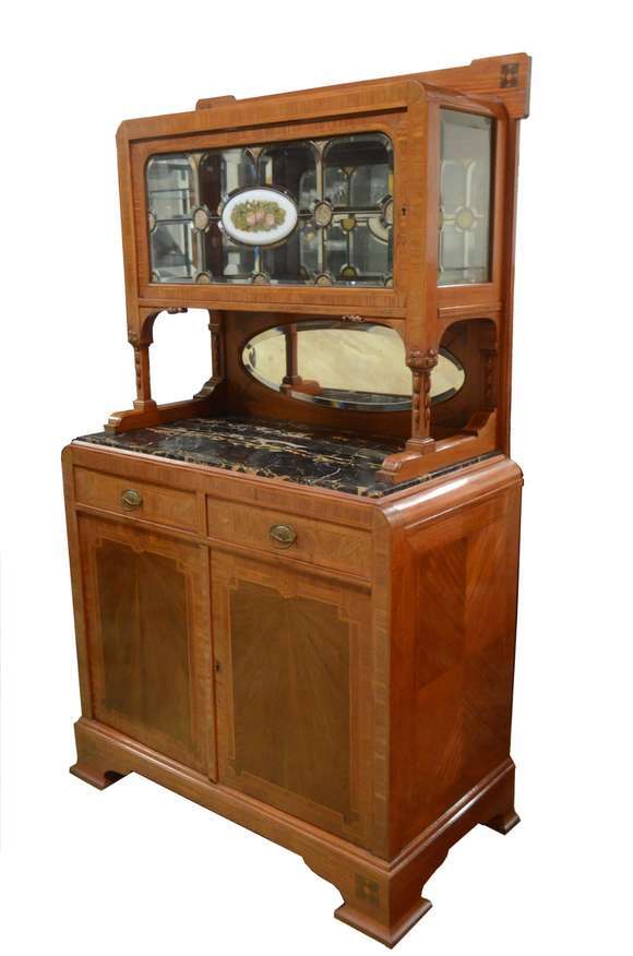 Móvel floreira de madeira parquetada feitio semi bombé, aplicações de bronze, alçada recortada com espelho de cristal...