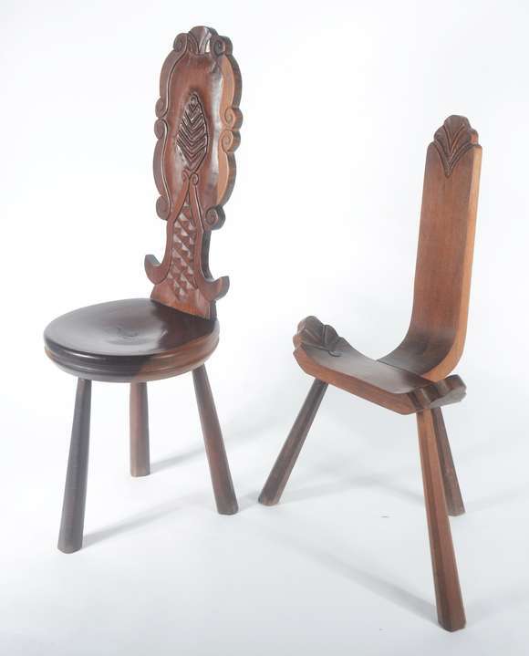 Duas cadeiras de madeira nobre com 3 pernas, uma delas com encosto entalhado.
