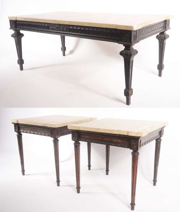 Conjunto com 3 mesas de madeira nobre, sendo par de laterais e uma de centro, esta de modelo ligeiramente diferente, ...